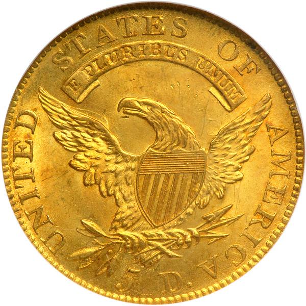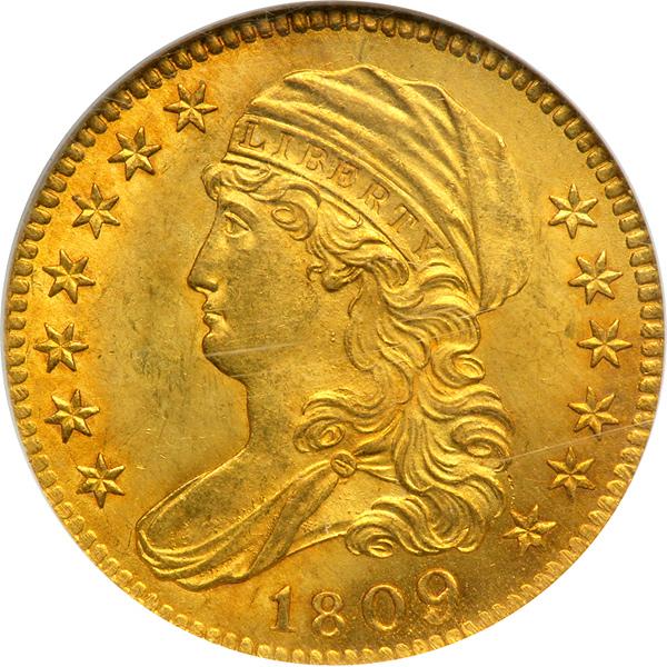 1809/8 $5 Capped Draped Bust. . BD-1. NGC graded MS-65. Well struck with lovely golden toning. A well struck frosty mint gem on a problem free planchet. The frosty surfaces gleam with intense mint luster. A total of 33,875 were minted. Rarely have we seen an 1809/8 Half Eagle as crisp and pleasing to the critical eye of the grading service; and to think it was released from to the Treasury for distribution over two hundred years ago! Hard to imagine such a thing is possible. The photographs do not lie, the design, the depth of strike, like the luster, is outstanding, in fact, exceptional. A well-made example with needle-sharp details. There are no bothersome abrasions or points of wear, either. One of the nicest specimens of this date we have seen, a coin that will be admired by those who to see it. A short mark below the eagle's lower beak serves as an identifier; dutiful searching with a glass reveals little else other than a stray line or minor change in the color of the toning here and there. A great beauty in Gem Mint State compared to lesser quality early gold pieces that may be technically Mint State; we hesitate to call it "world class" quality but where in the world would you find a finer specimen? A coin for a real connoisseur. Pop 9; none finer at NGC (PCGS # 8104) .
