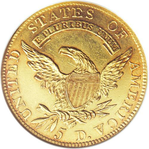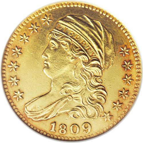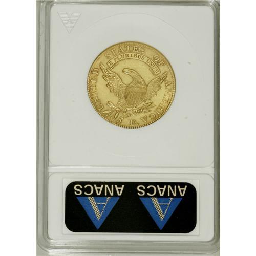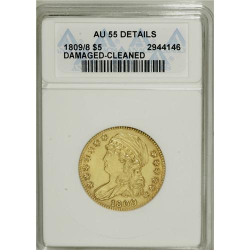<B>1809/8 $5 --Damaged, Cleaned--ANACS. AU55 Details.</B></I> Breen-6458, BD-1, High R.3. The only 1809-dated dies. This well struck example appears to be free from circulation wear, and adjustment marks are limited to the right-side denticles. The obverse has distributed tiny ticks, in addition to a few faint scratches. Both sides are unduly bright from cleaning, but a desirable piece nonetheless.<BR><BR><b>Shipping:</b> Coins & Currency (<a target="_blank" href="http://www.heritageauctions.com/common/shipping.php">view shipping information</a>)