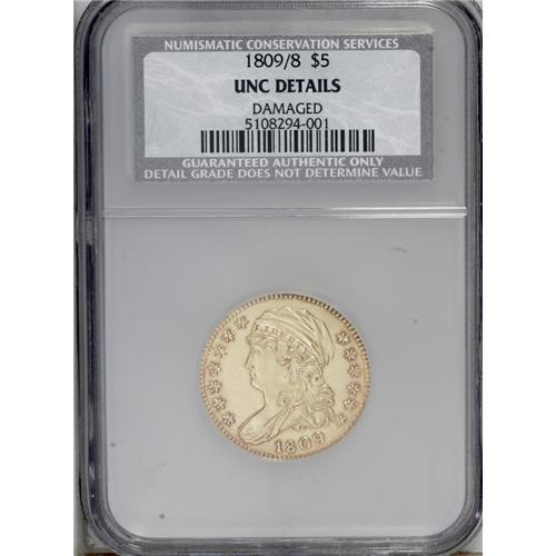 <B>1809/8<$5>--Damaged--NCS. Unc Details.</B></I> Breen-6458, BD-1, High R.3. Every design element on this example is boldly defined, although the surfaces have myriad abrasions and evidence of cleaning. We believe that the term "damaged" as recorded on the NCS holder may be a bit harsh. Perhaps the "improperly cleaned" designation might have been more appropriate.