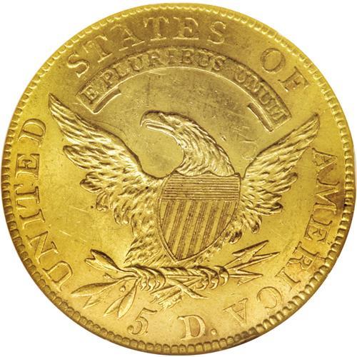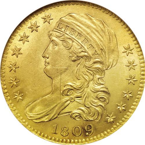 <B>1809/8 $5 MS61 NGC.</B></I> Breen-6458, BD-1, High R.3. Only one set of dies was used to strike 1809 half eagles, which are all overdates, although later die states show less undertype than earlier emissions. In the short-lived series of Capped Bust Left half eagles (1807-1812), the 1809 is the scarcest date. Both the recorded mintage of 1809 fives and the NGC <I>Census Report</B></I> support this claim.<BR> Breen points out the notch on one of the points of star 13, which he claims is the engraver's signature. This theory, first put forth by Don Taxay, suggests that John Reich, U.S. Mint assistant engraver from 1807 to 1817, purposely notched the lowest star on the right side of each die as a means to secretly sign his creations. There is no solid evidence to support the claim, although the fact that almost every die he engraved shows this peculiarity makes the notion feasible.<BR> The 9 is much larger than the other digits on this variety, and the remains of the underdigit are faint. Some researchers, John Dannreuther among them, doubt that it is an 8, saying it might be a previous 9. The yellow-green surfaces are highly lustrous, with a glint of copper-red at the date, and suggesting a higher grade without the benefit of a loupe. The loupe reveals a small scrape behind Liberty's mouth. A curious straight line of tiny dotlike indentations on the neck and upper bust appears to be of unknown post-strike origin. Despite the trivial impairments, this is a grand and enticing example of this issue. Census: 25 in 61, 88 finer (5/07).<BR><BR><b>Shipping:</b> Coins & Currency (<a target="_blank" href="http://www.heritageauctions.com/common/shipping.php">view shipping information</a>)