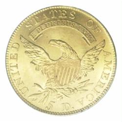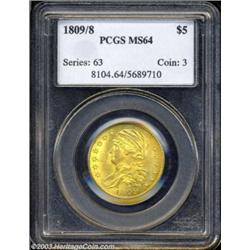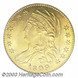 <table><tr><td><TABLE cellSpacing=0 cellPadding=0 width="100%" bgColor=#000000 border=0><TBODY> <TR><TD width="100%"><TABLE cellSpacing=1 cellPadding=3 width="100%" border=0><TBODY><TR><TD width="100%" bgColor=#79735c><FONT face=arial color=#ffffff size=3><B>Description</B> </FONT></TD></TR><TR><TD width="100%" bgColor=#ffffff><FONT face=arial size=2><B>1809/8 $5 MS64 PCGS.</B></I> B. 1-A, Miller-108, R.3. Only a single die variety of 1809 Half Eagles are known, all of which have traces of an underdigit 8 within the lower loop of the 9 in the date. The final star has a scalloped lower outer point, now regarded as the signature of Mint engraver John Reich, who is also credited as the coin's designer. The present near-Gem is well struck and has bright lemon-gold color. The reverse is impressively preserved, while the obverse field has only the faintest luster grazes. Struck from a clashed reverse die. </FONT></TD></TR></TBODY></TABLE></TD></TR></TBODY></TABLE><BR><A name=PricesRealized></A><TABLE cellSpacing=0 cellPadding=0 width="100%" bgColor=#000000 border=0><TBODY><TR><TD width="100%"><TABLE cellSpacing=1 cellPadding=3 width="100%" border=0><TBODY><TR><TD width="100%" bgColor=#79735c><A name=PR><FONT face=arial color=#ffffff size=3><B>Previous Prices from Heritage Auctions</B> </FONT></A></TD></TR><TR><TD bgColor=#f6f6ed><TABLE cellSpacing=0 cellPadding=0 width="100%" border=1><TBODY><TR><TD align=middle width="33%"><B>Date</B></TD><TD align=middle width="33%"><B>Service</B></TD><TD align=middle width="33%"><B>Price</B></TD></TR><TR bgColor=whitesmoke><TD width="33%"><B>06/10/2000</B></TD><TD width="33%">NGC</TD><TD width="33%">$21,275.00</TD></TR><TR bgColor=whitesmoke><TD width="33%"><B>06/01/2000</B></TD><TD width="33%">PCGS</TD><TD width="33%">$22,425.00</TD></TR><TR bgColor=whitesmoke><TD width="33%"><B>01/01/1990</B></TD><TD width="33%">PCGS</TD><TD width="33%">$44,550.00</TD></TR><TR bgColor=whitesmoke><TD width="33%"><B>05/01/1999</B></TD><TD width="33%">PCGS</TD><TD width="33%">$23,000.00</TD></TR></TBODY></TABLE></TD></TR><TR><TD bgColor=#ffffff><FONT face=arial size=1 ?>PLEASE NOTE: All prices realized reflect the final hammer price PLUS the buyer's premium in auctions that charge a buyer's premium. Each item has a notation at the top of the listing indicating whether that lot included a buyer's premium. Example: A item that sells with a final hammer price of $100 and a 20% buyer's premium will display with a price realized of $120. All information listed is intended to be as accurate as possible, but errors are possible. Please use this guide carefully and inform us of any inaccuracies. </FONT></TD></TR></TBODY></TABLE></TD></TR></TBODY></TABLE><BR><TABLE cellSpacing=0 cellPadding=0 width="100%" bgColor=#000000 border=0><TBODY><TR><TD width="100%"><TABLE cellSpacing=1 cellPadding=3 width="100%" border=0><TBODY><TR><TD width="100%" bgColor=#79735c colSpan=6><FONT face=arial color=#ffffff size=3><B>Price Guide*</B> </FONT></TD></TR><TR bgColor=#f6f6ed><TD align=middle><B>Grade</B> </TD><TD align=middle><B>Coin World<BR>(Trends)</B> </TD><TD align=middle><B>Numismedia<BR>Retail</B> </TD><TD align=middle><B>Numismedia<BR>Wholesale</B> </TD><TD align=middle><B>Coin<BR>Universe</B> </TD><TD align=middle><B>Heritage<BR>Value Index</B> </TD></TR><TR bgColor=#ffffff><TD align=middle>63</TD><TD align=right>$20,000.00</TD><TD align=right>---</TD><TD align=right>$12,500.00</TD><TD align=right>$17,600.00</TD><TD align=right>$12,148.33</TD></TR><TR style="FONT-WEIGHT: bold" bgColor=#cccfdd><TD align=middle>64</TD><TD align=right>$30,000.00</TD><TD align=right>---</TD><TD align=right>$23,450.00</TD><TD align=right>$34,000.00</TD><TD align=right>$20,783.33</TD></TR><TR bgColor=#ffffff><TD align=middle>65</TD><TD align=right>---</TD><TD align=right>---</TD><TD align=right>---</TD><TD align=right>---</TD><TD align=right>---</TD></TR><TR bgColor=#ffffff><TD colSpan=6><FONT size=1>*All information listed is intended to be as accurate as possible, but errors are possible. No item may be returned or refused based on this information which is provided as a service to our customers. You should contact each pricing source directly to determine the accuracy of this information. </FONT></TD></TR></TBODY></TABLE></TD></TR></TBODY></TABLE><BR><TABLE cellSpacing=0 cellPadding=0 width="100%" bgColor=#000000 border=0><TBODY><TR><TD width="100%"><TABLE cellSpacing=1 cellPadding=3 width="100%" border=0><TBODY><TR><TD width="100%" bgColor=#79735c><FONT face=arial color=#ffffff size=3><B>Population Guide</B> </FONT></TD></TR><TR bgColor=#ffffff><TD align=middle><!-- Begin Output of Population Grid--><TABLE cellSpacing=0 cellPadding=0 width="100%" border=0><TBODY><TR><TD vAlign=center><TABLE cellSpacing=0 width="100%" border=1 cellsadding="3"><TBODY><TR><TD vAlign=center><TABLE cellSpacing=0 cellPadding=3 width="100%" border=1><TBODY><TR><TD vAlign=center align=middle bgColor=#f0f1e8 colSpan=2 <CENTER><FONT face=Arial size=2><B>PCGS Pop </B></FONT><CENTER></CENTER></TD><TD vAlign=center align=middle bgColor=#f0f1e8 colSpan=2><CENTER><FONT face=Arial size=2><B>NGC Pop</B></CENTER></FONT></TD></TR><TR><TD vAlign=center><FONT face=Arial size=2>(64)</FONT> </TD><TD vAlign=center align=right><FONT face=Arial size=2>20</FONT> </TD><TD vAlign=center><FONT face=Arial size=2>(64)</FONT> </TD><TD vAlign=center align=right><FONT face=Arial size=2>16</FONT> </TD></TR><TR><TD vAlign=center><FONT face=Arial size=2>(>64)</FONT> </TD><TD vAlign=center align=right><FONT face=Arial size=2>3</FONT> </TD><TD vAlign=center><FONT face=Arial size=2>(>64)</FONT> </TD><TD vAlign=center align=right><FONT face=Arial size=2>7</FONT> </TD></TR></TBODY></TABLE></TD></TR></TBODY></TABLE></TD></TR></TBODY></TABLE><!-- End Output of Population Grid--></TD></TR></TBODY></TABLE></TD></TR></TBODY></TABLE><BR><TABLE cellSpacing=0 cellPadding=0 width="100%" bgColor=#000000 border=0><TBODY><TR> Important notice: Heritage usually auctions material a