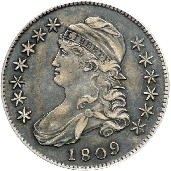 1809 Capped Bust Half Dollar. Experimental edge, "xxxx' between words. . O-102. PCGS graded VF-35. Popular Red Book variety. Toned. This variety has a row of segments below the scroll which are clash marked between the scroll and eagle's head (PCGS # 6093) .