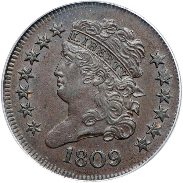 1809 C-2 R3. PCGS graded MS-62 Brown. Frosty chocolate and bluish steel brown with the luster and eye appeal of a mint state piece. Just a hint of rub on the highest points. The only defect is a shallow scrape on the rim at F-AMER. LDS, Manley state 4.0 late. The rim cud break at F-A is clear, a smaller one shows over the M, and another is visible at star 11. The reverse is rotated 10 degrees CCW. An attractive example; tied for CC#4 in the Spurlock census for this scarce variety. Our grade is AU55. PCGS population 1; none finer. The attribution and Davy provenance are noted on the PCGS label. Davy #09.2.5.
