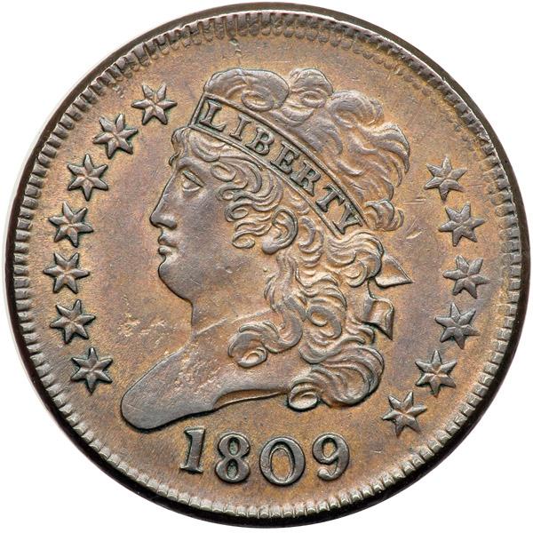 1809 C-4 R2 Repunched 0 in Date, Large over Small AU58. Glossy tan and light brown with darker steel brown and chocolate toning on the highpoints. Ample traces of lustrous light golden brown faded down from mint color remain in the protected areas on both sides. The only marks are four barely visible thin scuffs or dull scratches in the field above the back of the head and a couple very shallow planchet flakes in the field above star 1, as struck. E-MDS, Manley state 1.0. The dies are still sharp and the dentilation is complete. The reverse is rotated 10 degrees CW and is slightly misaligned to K-5. The small 0 inside the normal 0 in the date is clear. Apparently the mint worker used the wrong numeral punch, then corrected his mistake but failed to efface the evidence of his error. Stuff happens. This is the Manley plate coin for the variety (large photos) and for state 1.0, both on page 207. Noyes photo #73615.