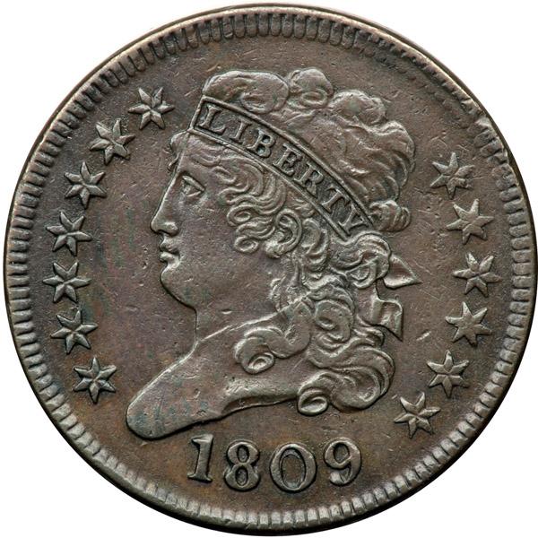 1809 C-4 R2 Repunched 0 in Date VF30+. Small 0 inside Larger 0 in Date. Attractive light olive brown and chocolate with slightly lighter steel brown toning on the upper right of the reverse from a too-vigorous brushing in that area. Very nice for the grade, close to VF35. The best identifying mark is a dull, light rim nick above star 8. MDS, Manley state 1.0. The dies are starting to show fine radial flowlines but the small 0 inside the normal 0 in the date is sharp. The always-present die hub flaw across the neck into the hair right of the Y is strong. Davy #09.4.11.