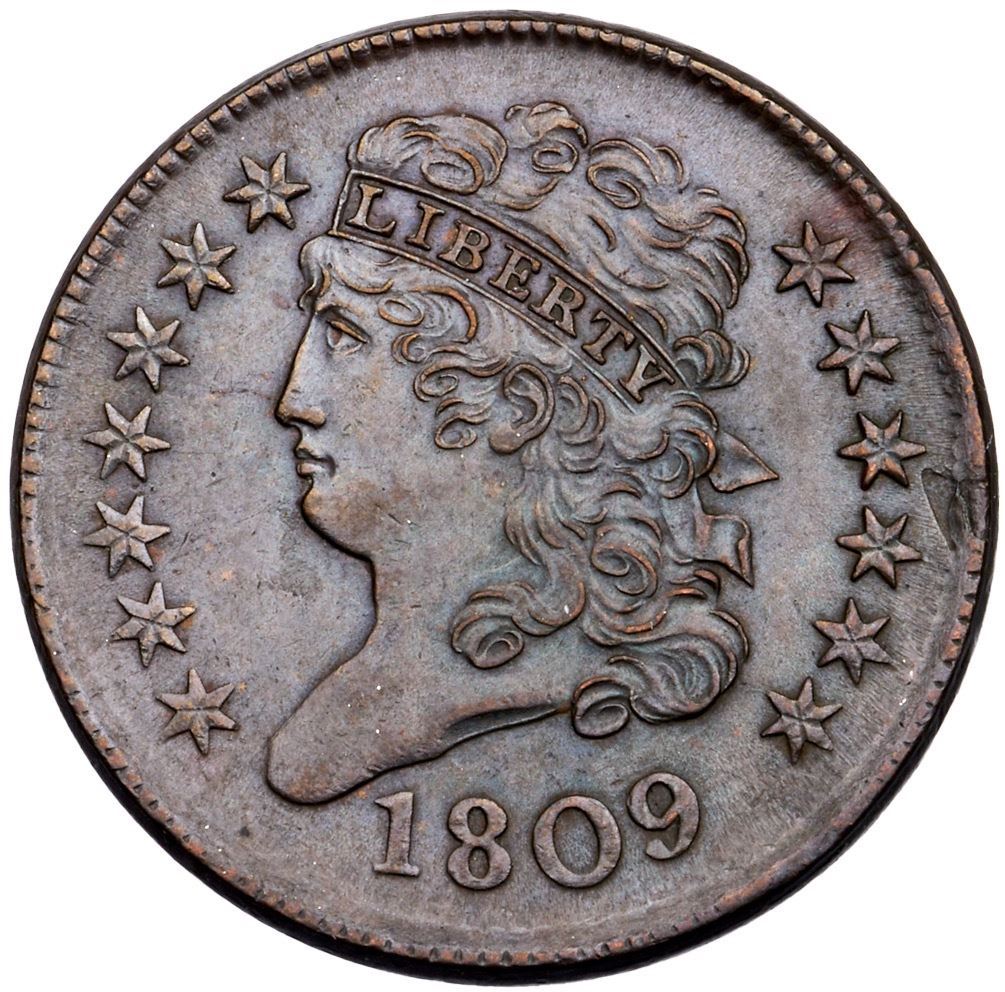 1809 C-6 R-1 AU58Lustrous medium to dark olive brown, lighter on the reverse, with hints of underlying light brown mellowed down from faded mint color in the reverse protected areas. There is a minor planchet flaw on the obverse right of stars 10-11, as struck, otherwise free of notable marks or distractions. Mint state eye appeal with just a touch of rub on the highest points. Manley state 2.0, with a rim break in the dentils at stars 9-10 and the repunching on star 9 is clear.Certificate Number: Pedigree: Ex; eBay 2011 - Furnace Run Collection - Shawn Yancey 7/19/2020 - Bob Kebler Collection