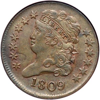 1809 C-6 R1. ANACS graded AU details net EF40 for corrosion. Lightly cleaned and retoned glossy olive and steel with traces of reddish brown toning in some of the protected areas on the obverse. The planchet is smooth except for a small area of very shallow erosion right of star 2, and this area may be a planchet flaw rather than post-strike deterioration. M-LDS, Manley state 5.0. The reverse is rotated 150 degrees CCW. Our grade is net VF30.