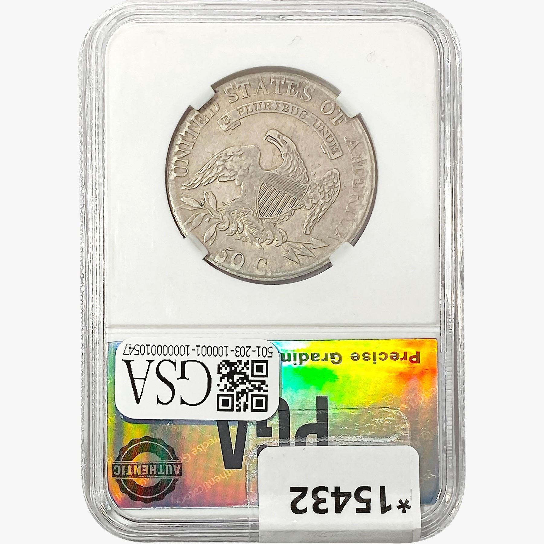 l. All non-certified coins and currency are guaranteed genuine, but are not guaranteed as to grade, since grading is a matter of opinion, an art and not a science, and therefore the description rendered by GSA or any third-party grading service may not agree with the opinion of others (including trained experts), and the same expert may not grade the same item with the same grade at two different times. GSA may, but is not obligated to, express an opinion as to non-certified numismatic items, in GSA's opinion, or by its employees' experience and the current interpretation of the American Numismatic Association's standards as of the date the catalog was prepared. There is no guarantee or warranty expressed or implied that the grading opinions utilized by GSA, if any, will meet the standards of any grading service at any time in the future.