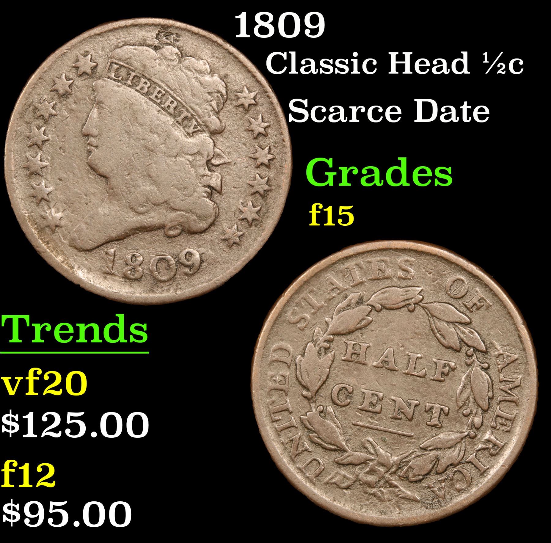 1809 Classic Head half cent 1/2c Grades f+. Scarce Date ; . A Corey's Pick