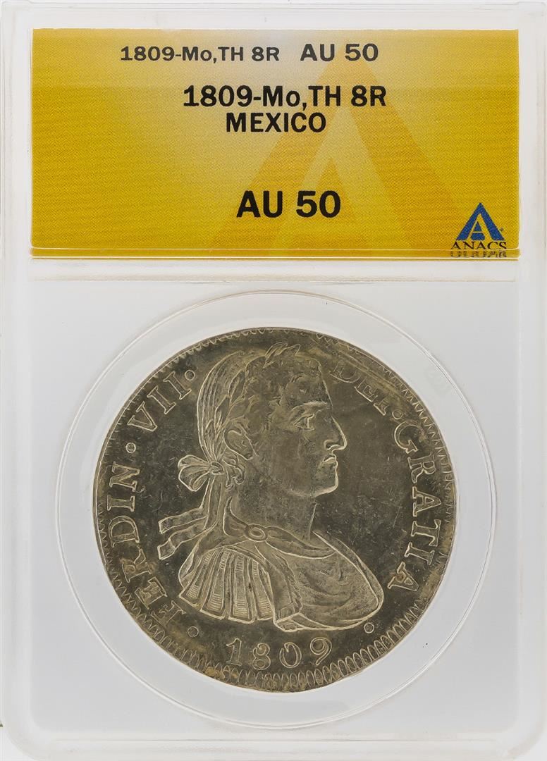One 1809-Mo TH Mexico 8 Reales Silver Coin ANACS AU50 . ANACS Certified.
