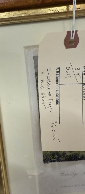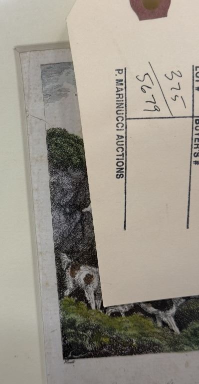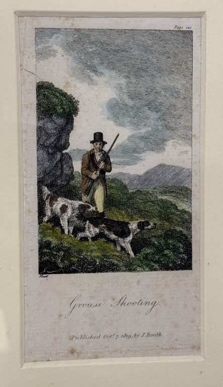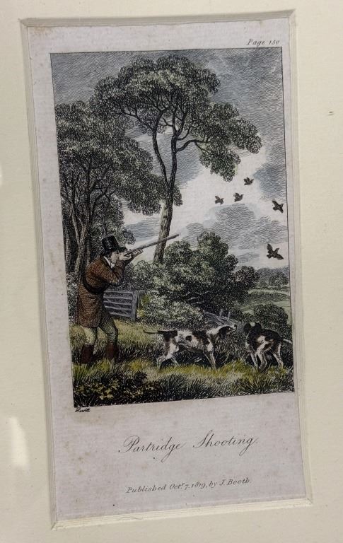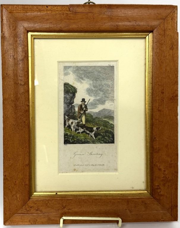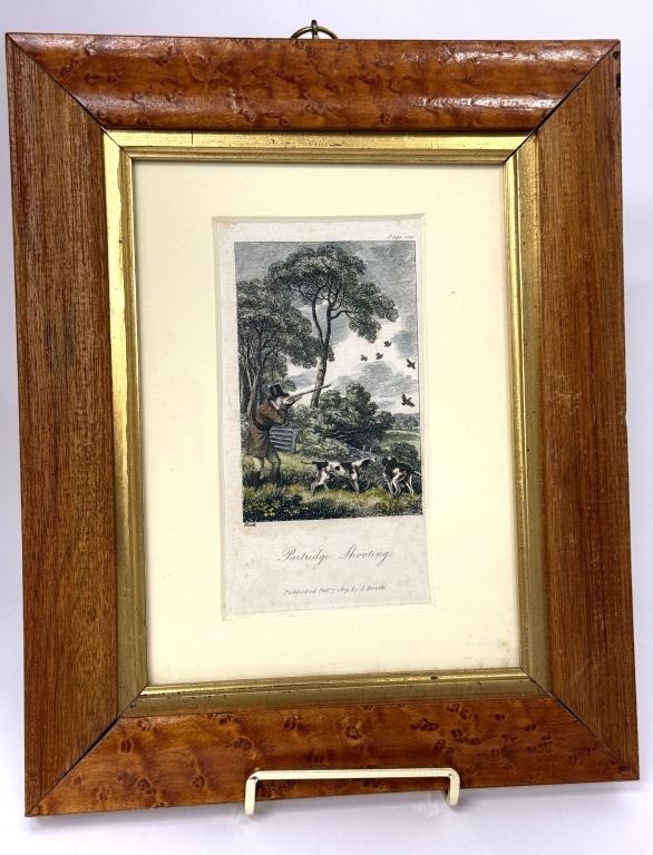 Item/Description: Two hand-colored engraved sporting plate prints of game bird hunting, titled "Partridge Shooting" and "Grouse Shooting", published October 1809. Each depicting a gentleman shooting with dogs in a rural landscape. Mounted and glazed in a later period wooden frames with a gilt slip.