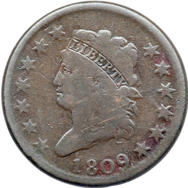 1809 S-280 R2 G5. Glossy chocolate and light olive brown. There are a few faint hairlines that break the toning on the portrait but the remainder of the toning is intact. Smooth and quite attractive for the grade in spite of the minor marks. The date is clear and the legends are strong.