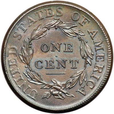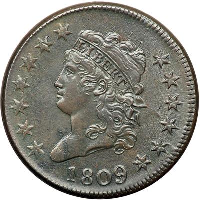 1809 S-280 R2. PCGS graded MS-63 Brown. Turban Head. Attractive lustrous light olive and chocolate brown with hints of bluish steel overtone in protected areas, especially on the reverse. A thin streak of darker olive brown toning from a minor impurity in the planchet crosses the bust tip and reaches the peak of the 1 in the date. The only sign of contact is a tiny pinprick in the field over the back of the head. There is a very light touch of rub on the highpoints of the obverse, and the reverse is mint state. Excellent eye appeal. MDS, Breen state VI, with a small incuse defect over the left upright of the M in AMERICA. Our grade is AU-58. Tied for CC#4 as MS60 in the Bland census. Noyes says MS60 net AU50 and tied for CC#7, his photo #28717. PCGS Population 1; None finer at PCGS for the variety. DWH #3395.