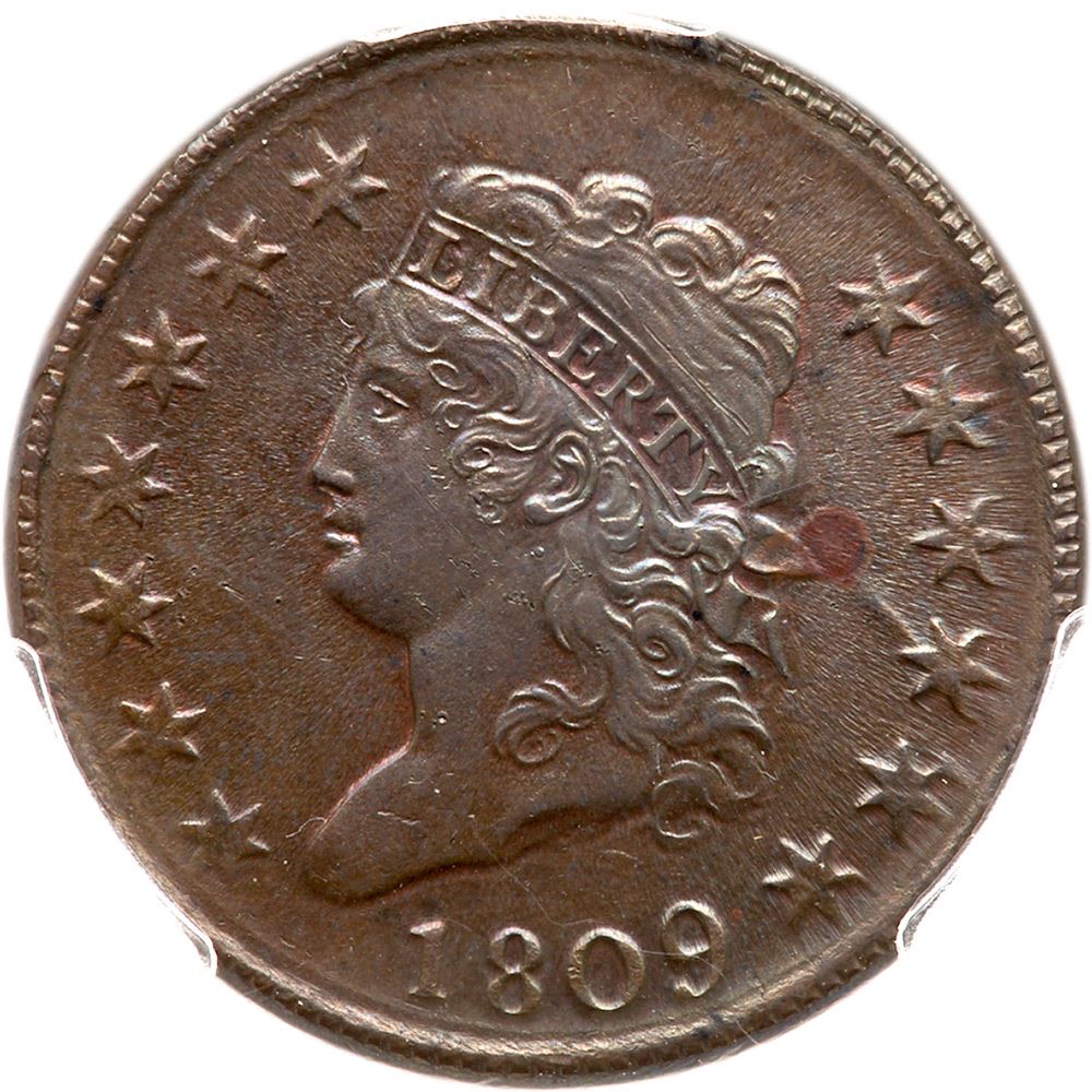 1809 S-280 R2 PCGS graded MS63 Brown. Lustrous light bluish steel brown with subtle rose faded down from mint color in protected areas. The only marks are several microscopic ticks high on the neck and an obvious spot of darker toning not carbon touching the ribbon left of star 10. Later die state with flowlined fields and die cracks at the top of the reverse. Graded MS61 and CC#3 in the Noyes census, his photo #69005. Our grade is MS60. A great 1809 cent and it comes with a wonderful provenance. The attribution and Eliasberg provenance are noted on the PCGS label. PCGS population 1; 2 finer in 64. PCGS #36466. Estimated Value 20,000 - UP