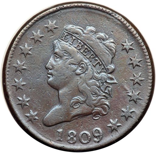 1809 S-280 R2 Turban Head VF20. Slightly sharper, especially on the reverse where the details suggest a VF30 grade, but this piece was lightly cleaned and is nicely retoned glossy light to medium chocolate brown. Smooth and attractive, void of any hint of roughness or verdigris, and the only notable mark is a shallow planchet flake at the dentils off the end of the wreath ribbon. MDS. A date that is tough to find in grades above Fine with smooth surfaces.