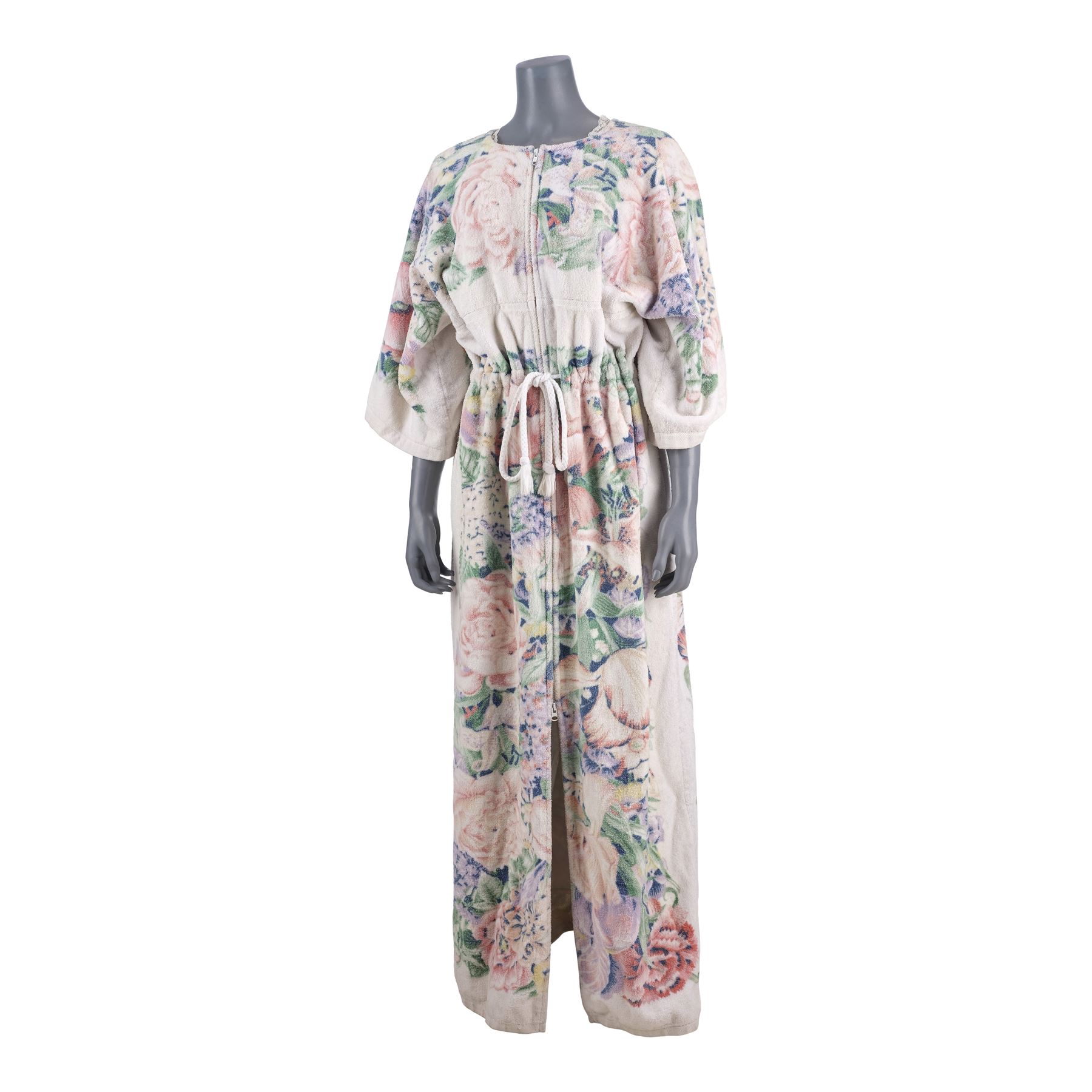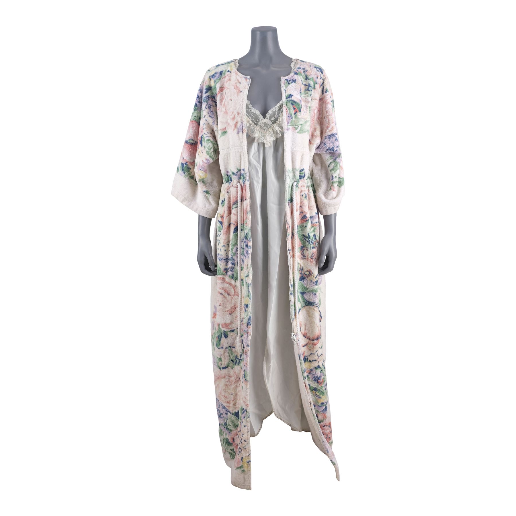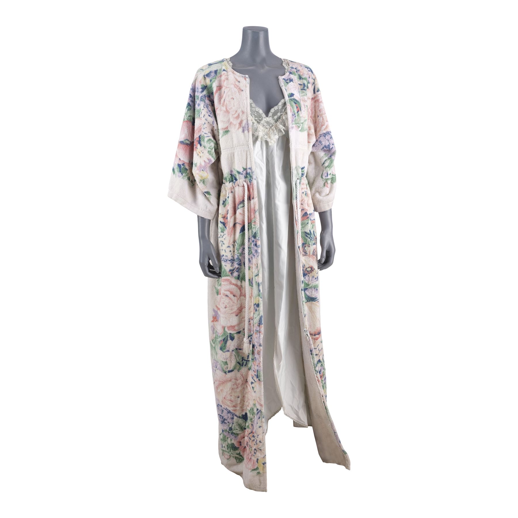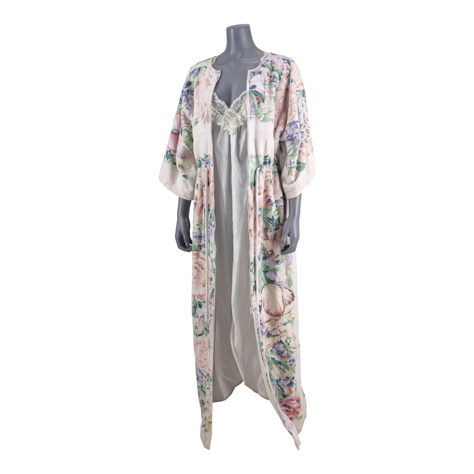 This lot consists of a white satin and cotton nightgown with blue satin ribbon roses and lace trim; and a floral print terry cloth Royalty by Rosanna Mode robe featuring a zipper front. This lot exhibits discoloration on the gown.