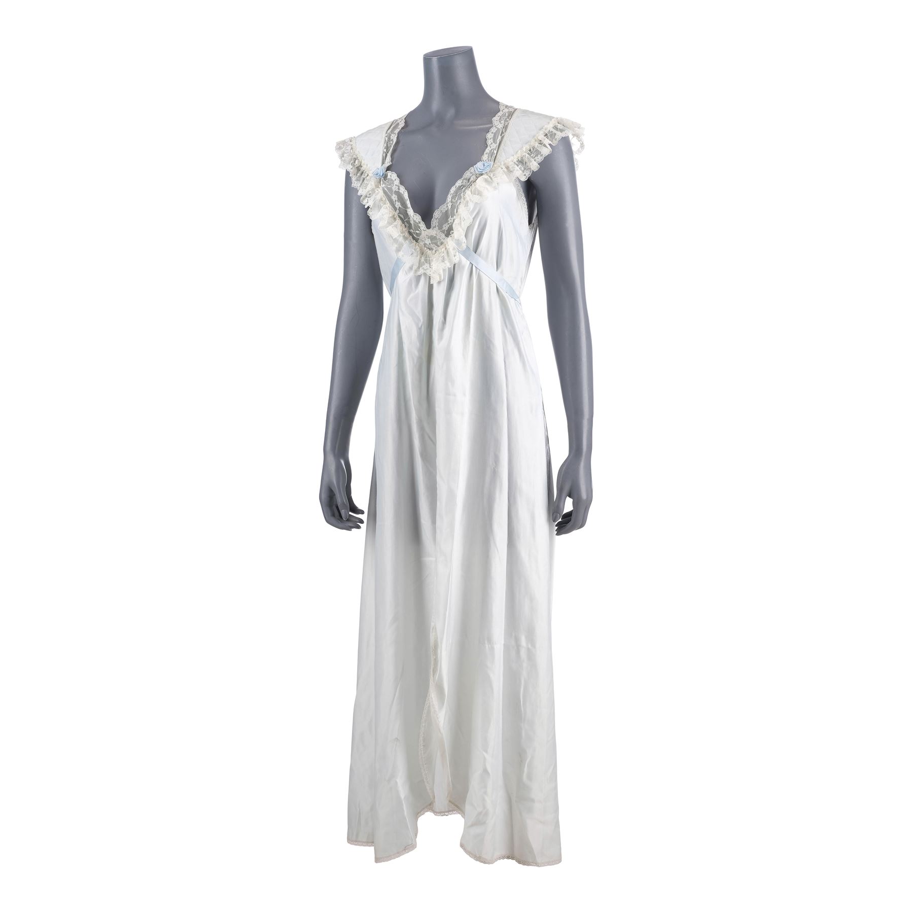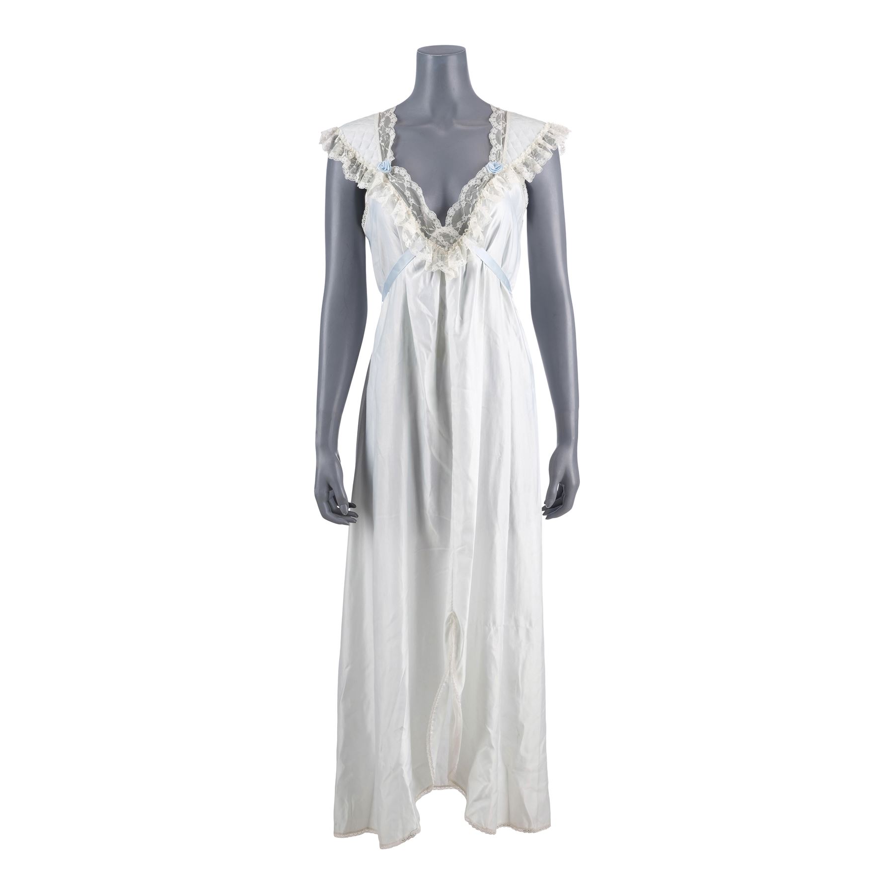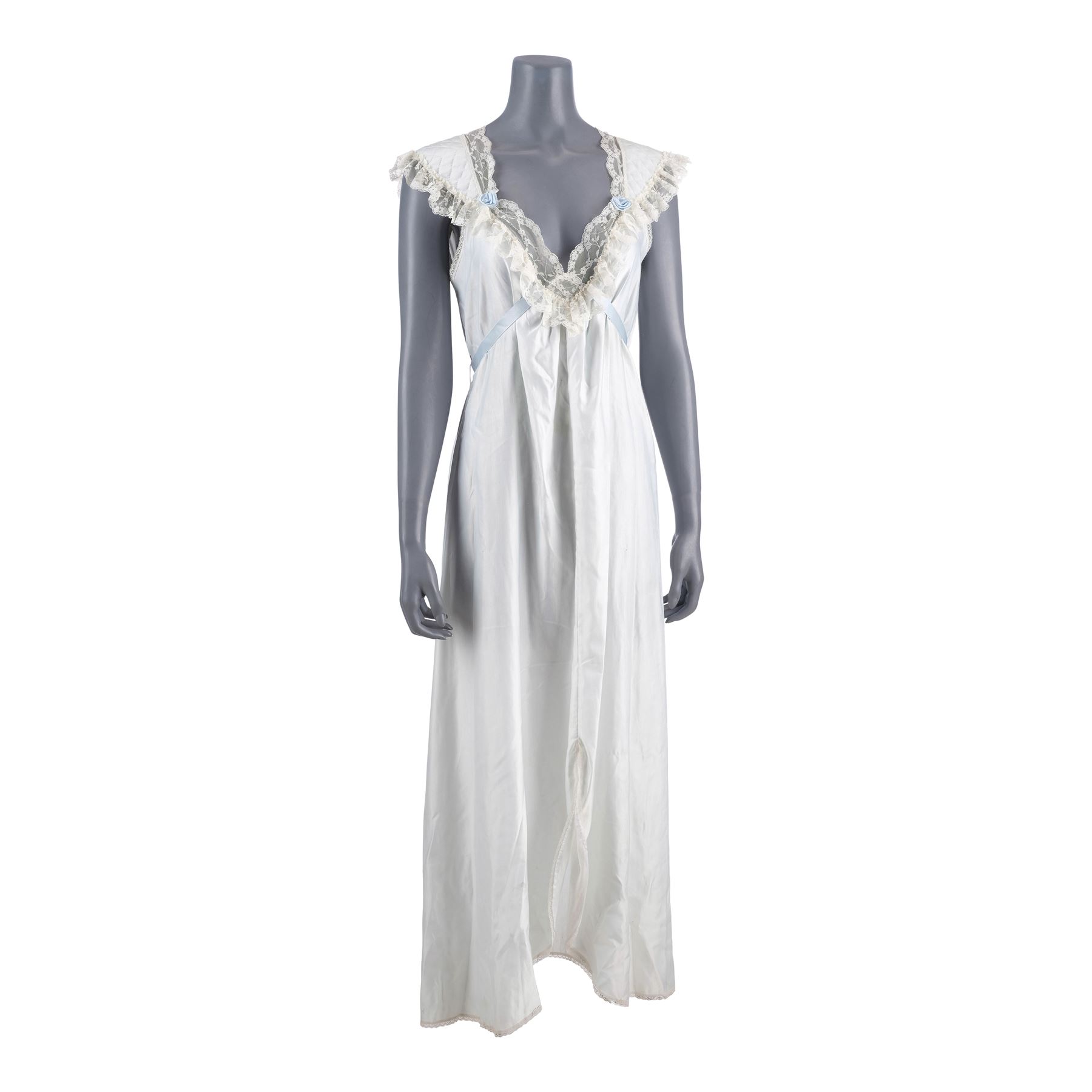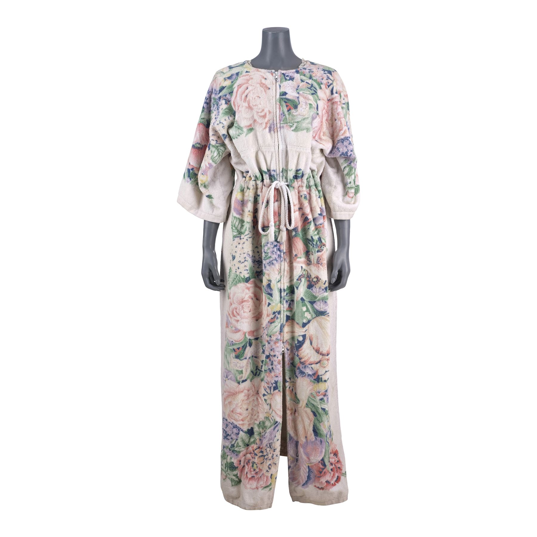 This lot consists of a white satin and cotton nightgown with blue satin ribbon roses and lace trim; and a floral print terry cloth Royalty by Rosanna Mode robe featuring a zipper front. This lot exhibits discoloration on the gown.