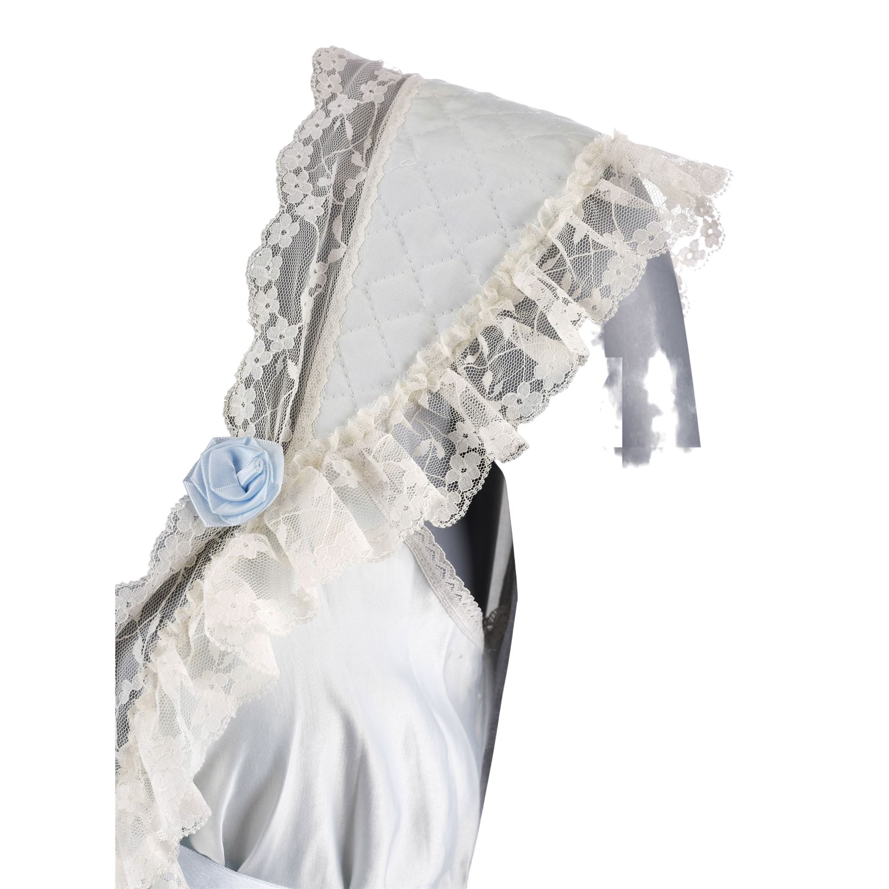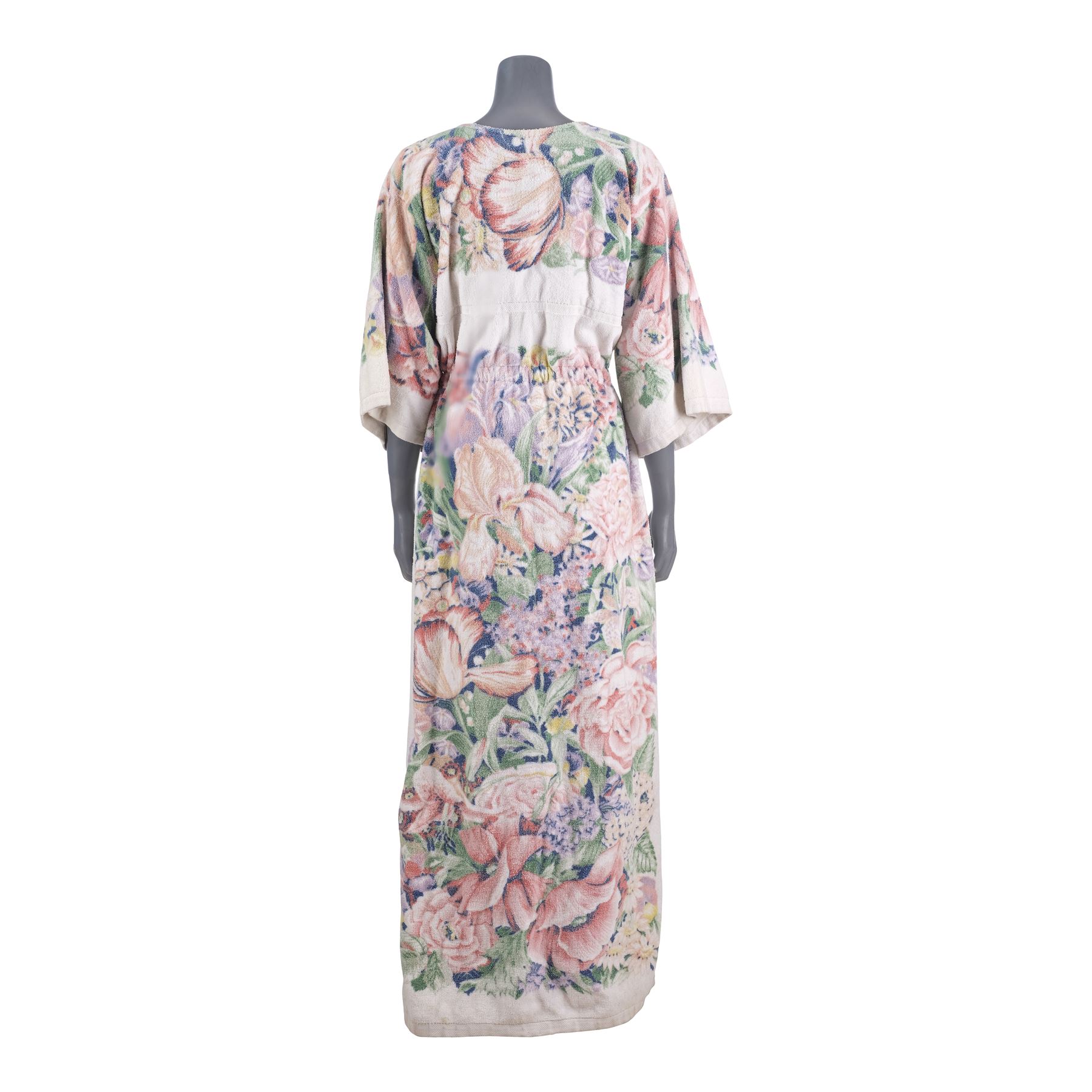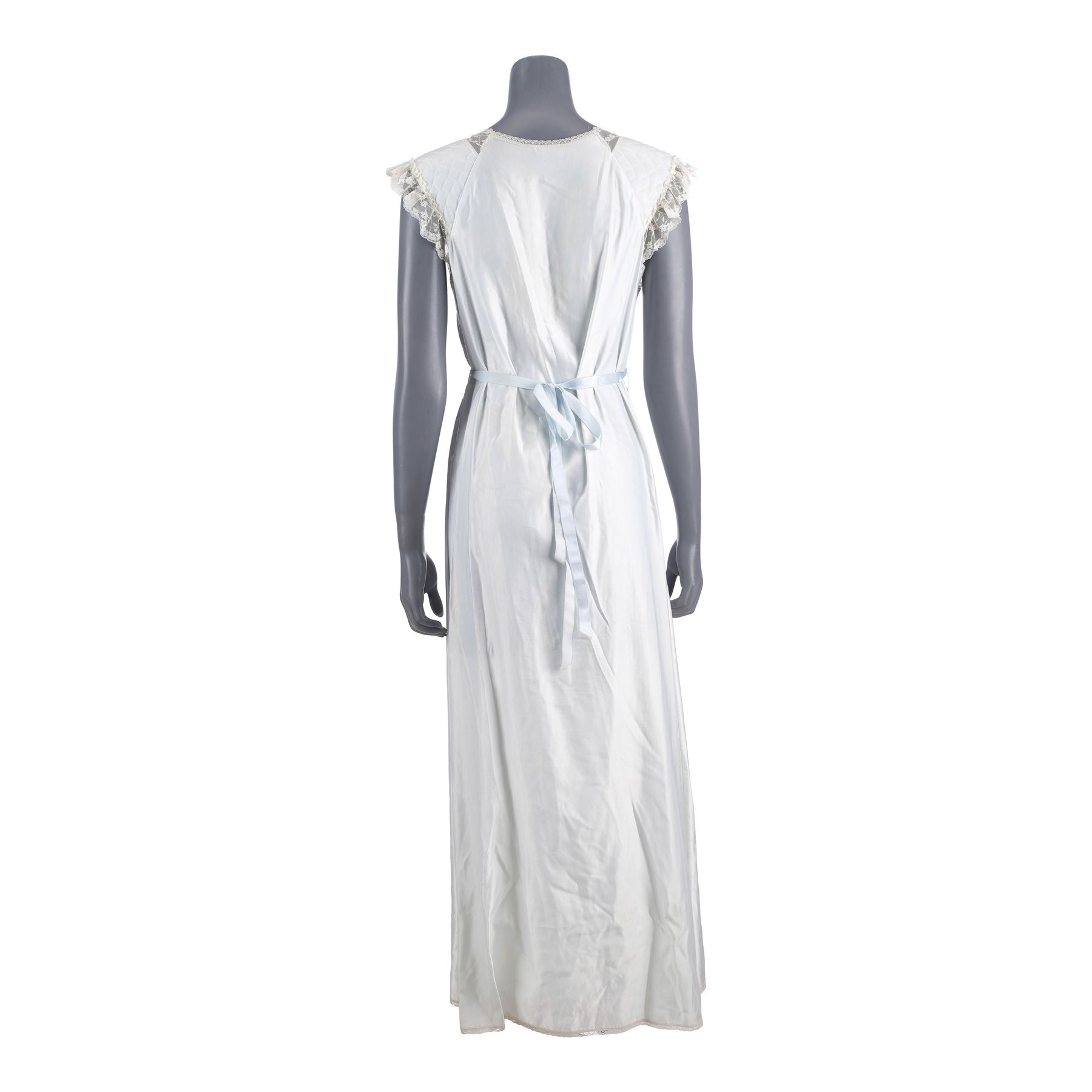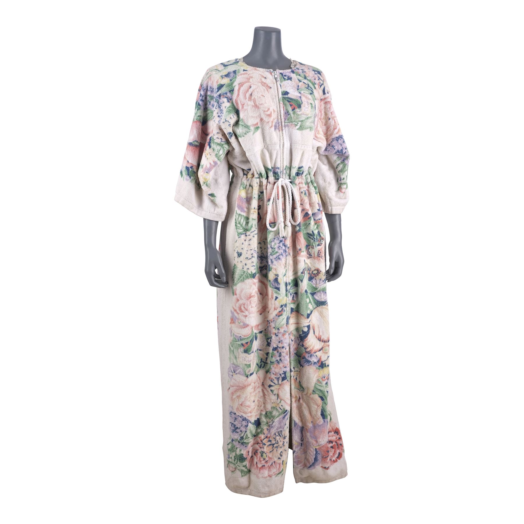 This lot consists of a white satin and cotton nightgown with blue satin ribbon roses and lace trim; and a floral print terry cloth Royalty by Rosanna Mode robe featuring a zipper front. This lot exhibits discoloration on the gown.