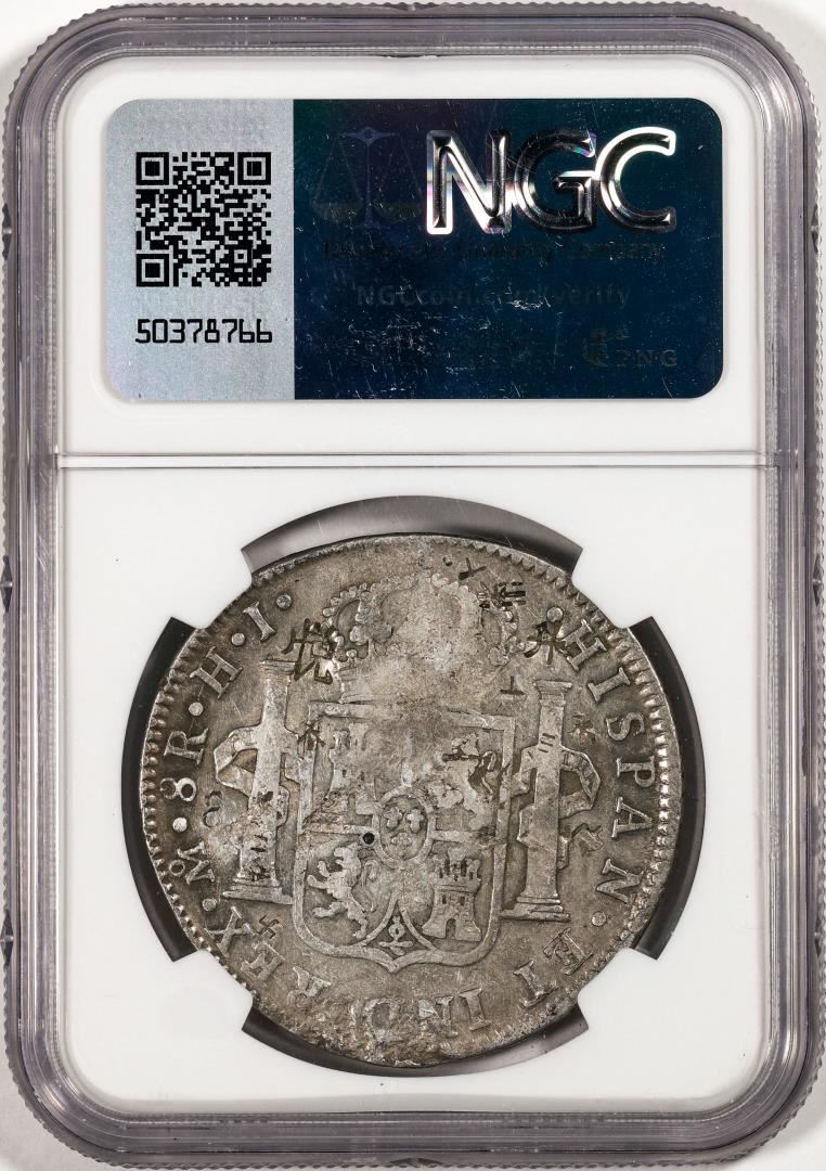 One 1809MO HJ Mexico 8 Reales Silver Coin NGC Chopmarked. NGC Certified.