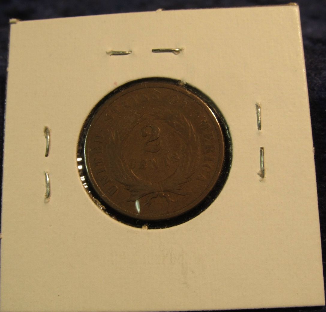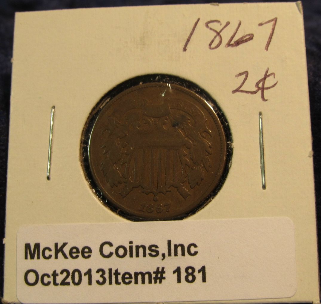 181. 1867 U.S. Two Cent Piece. VG-8. Redbook value $19.00.