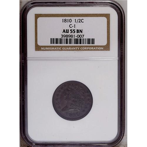<B>1810 1/2 C AU55 NGC.</B></I> B-1, C-1, R.2. A glossy golden-brown representative, crisply struck save for some softness along the right borders, because of the die alignment. No conspicuous marks are located. Struck from widely rotated dies. EAC 45.