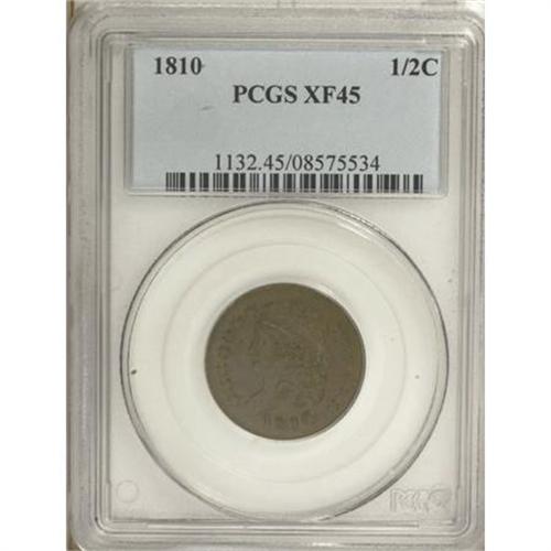 <B>1810 1/2 C XF45 PCGS.</B></I> C-1, B-1, R.2. The only dies for this underappreciated date. The deep brown surfaces display sky-blue undertones. A richly detailed example with a few faded obverse abrasions. EAC 30.<BR><BR><B>Coin Engraver:</B> John Reich<BR><BR><b>Shipping:</b> Coins & Currency (<a target="_blank" href="http://www.heritageauctions.com/common/shipping.php">view shipping information</a>)