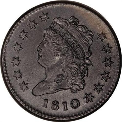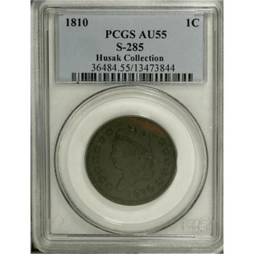 <B>1810 1C AU55 PCGS. S-285, B-2, R.2. </B></I> <B>Noyes VF35; CC-14. Photo #34843. Our EAC Grade XF40.<BR><BR>Equivalents. </B></I>McGirk 2B; Clapp 5; EAC 2; <I>Encyclopedia </B></I>1777; PCGS #1549.<BR><B><BR>Variety. </B></I>Dentils are broad and coarse. Leaf point below left base of I in UNITED. The obverse appears on S-285. The reverse appears on S-285.<BR><B><BR>Surfaces. </B></I>Deep steel-brown on both sides is interrupted by a small splash of tan at the upper right obverse, and similar color on the reverse. A few microscopic hairlines and tiny nicks are of no concern. The grade is determined by a trace of wear on the highest design points. Slight weakness is evident inside the left obverse and reverse borders, but this piece is sharper than most.<BR><B><BR>Die State III. </B></I>The obverse is cracked through the base of 10 and all outer star points to the left. Strong clash marks have developed, and faint flowlines are only evident on the reverse.<BR><B><BR>Census. </B></I>Ten to 12 AU or finer examples are known, depending on the Census consulted. The finest known is the former Haig Koshkarian coin that American Numismatic Rarities sold in a 2004 auction.<BR><B><BR>Commentary. </B></I>Pete Smith considers the rarity of the four normal date 1810 cents equal: "Same frequency as S282, S283, and S284." In our opinion, S-285 is toughest, followed by S-283, S-282, and S-284.<BR><BR><B>Provenance. </B></I><I>Robinson, Victor-McCawley (1988); Robinson S. Brown, Jr. (Superior, 1/1996), lot 390, $1,540; Chris Victor-McCawley (7/2005).</B></I><BR><BR><b>Shipping:</b> Coins & Currency (<a target="_blank" href="http://www.heritageauctions.com/common/shipping.php">view shipping information</a>)