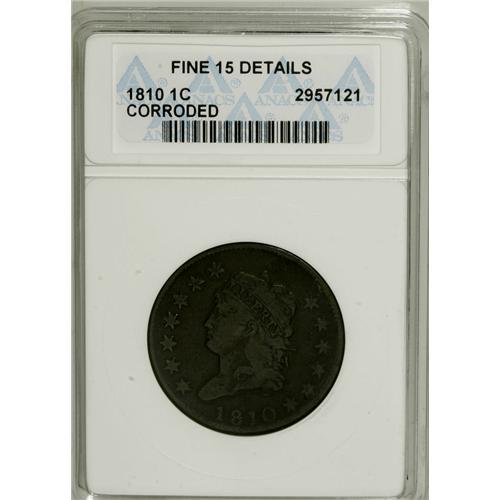 <B>1810 1C --Corroded--ANACS. Fine 15 Details.</B></I> NGC Census: (5/69). PCGS Population (6/77). Mintage: 1,458,500. Numismedia Wsl. Price: $255. (#1549)<BR><BR><b>Shipping:</b> Coins & Currency (<a target="_blank" href="http://www.heritageauctions.com/common/shipping.php">view shipping information</a>)