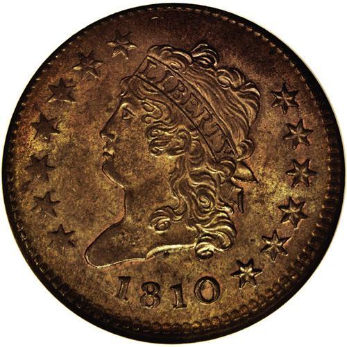 <B>1810<1C> MS65 Brown NGC.</B></I> S-285, B-2, R.2. This important cent has been known to the Large cent community since the 19th century, and has long been regarded as one of the two finest known examples of the S-285 variety. In its appearance in Abe Kosoff's auction of the Dr. Sloss collection, the present piece was graded MS70. More recently, William C. Noyes in his 1999 <I>Official CQR/Noyes Condition Census</B></I> listed it in sole first place for the S-285, grading it Choice MS65. Its close competitor for the coveted honor of finest known is the DuPont/Gene Reale piece, which Noyes graded Choice MS63. The lustrous and smooth surfaces are about evenly divided into medium brown and faded gold, and the strike is sharp aside from the first few stars. The profile is lightly strike doubled, and the reverse is clashed inside the upper wreath. Pinpoint flecks at 1 o'clock and beneath the center of the bust truncation identify this memorable and formidably pedigreed example. EAC 65.<BR><I>Ex: Richard Winsor Collection (S.H. and Henry Chapman, 12/1895), lot 892; Dr. James O. Sloss Sale (Kosoff, 10/59), lot 111; Tad Collection (Stack's, 2/76), lot 81; Robinson S. Brown, Jr. Collection (Superior, 9/86), lot 421; Haig A. Koshkarian Collection (American Numismatic Rarities, 3/04), lot 11. The lot cards from the Stack's, Superior, and ANR auction appearances are included.</B></I>
