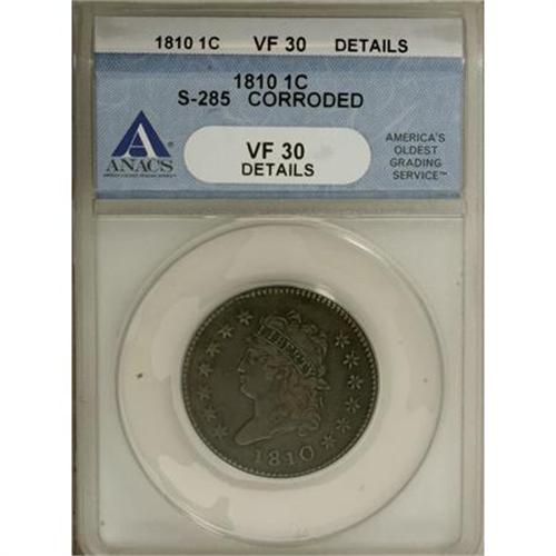 <B>1810 1C --Corroded--ANACS. VF30 Details.</B></I> S-285. NGC Census: (2/42). PCGS Population (7/59). Mintage: 1,458,500. Numismedia Wsl. Price for NGC/PCGS coin in VF30: $495. (#1549)<BR><BR><B>Coin Engraver:</B> John Reich<BR><BR><b>Shipping:</b> Coins & Currency (<a target="_blank" href="http://www.heritageauctions.com/common/shipping.php">view shipping information</a>)