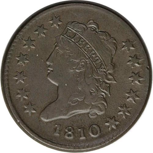 <B>1810<1C> S-285, B-2, R.3. XF45 NGC. XF40 EAC.</B></I> State III. A nice dark brown specimen. The surfaces are even and smooth. The reverse clash marks to the left of the E and T of ONE CENT are very visible. There are also strong clash marks from the word LIBERTY on the obverse is visible through the T of CENT. There is one minor nick at the edge of the obverse between star 9 and star 10. This is only mentioned for identification purposes, as it is only seen under magnification. The strong date and other details make this coin an excellent example of the date or type.<BR><I>Ex: George Ramont (2/17/1995).</B></I> Envelope Included.