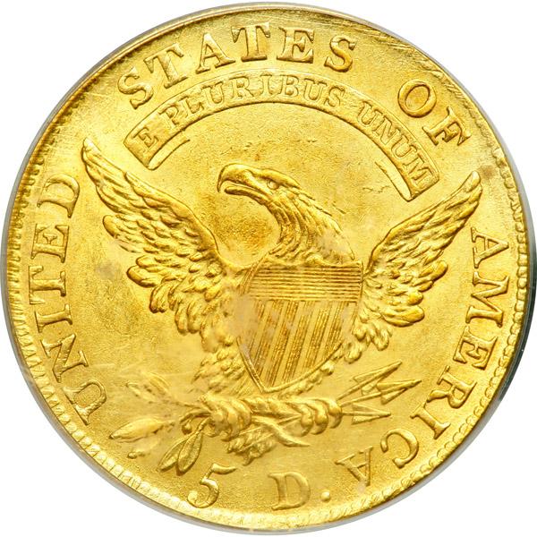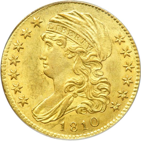 1810 $5 Capped Draped Bust. Small date, large 5. . BD-1, Breen-6462. PCGS graded MS-61. By all reckoning this has a decent strike on a problem-free planchet with light golden toning. An inspiring and lustrous coin it is, in fact, with frosty support beneath vibrant golden color. The reverse and obverse centers play host to a brilliance and originality always appreciated by the stronger buyers. In short, a lovely coin, one that certainly meets the qualifications for MS61 grade. A hint of weakness at the hair curls and eagle is typically seen on these early Capped Draped Bust fives, but is missing on this sharply struck 1810 specimen, with the key central areas strongly hit by the dies. Pop 7; 33 finer at PCGS (PCGS # 8106) .