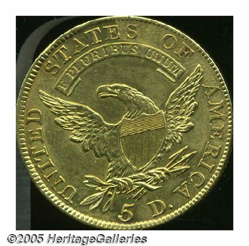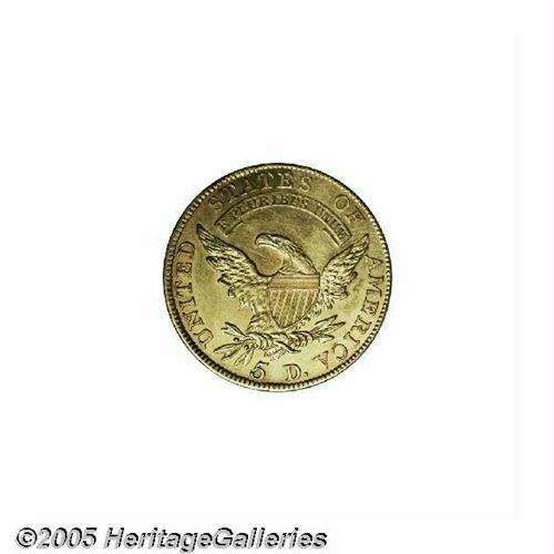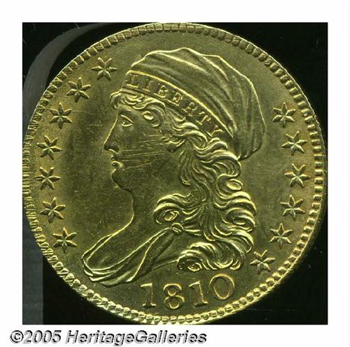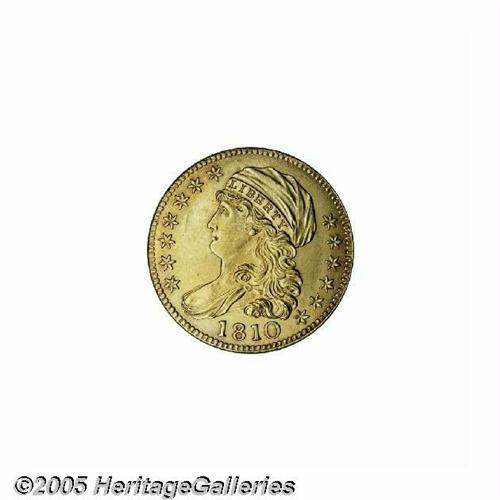<B>1810<$5> Large Date, Large 5 AU58, Brushed, Uncertified.</B></I> Breen-6459, B. 1-A, Miller-109, R.2. Brushed at some time in the past with resulting hairlines. We also note a few thin adjustment marks on Liberty's face and the left rim. Sharply struck by the dies, and with few other signs of handling.