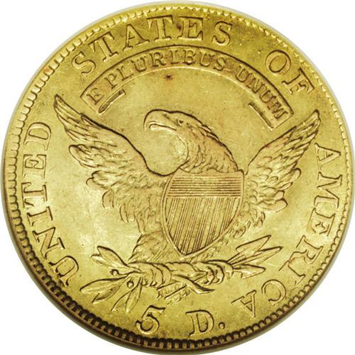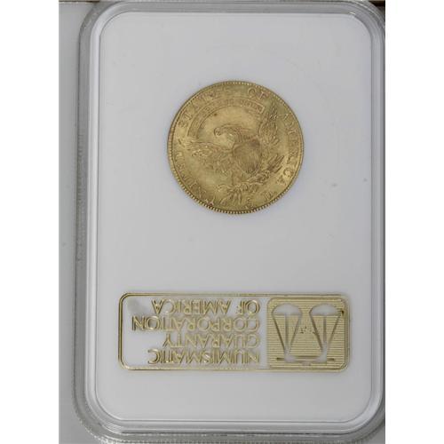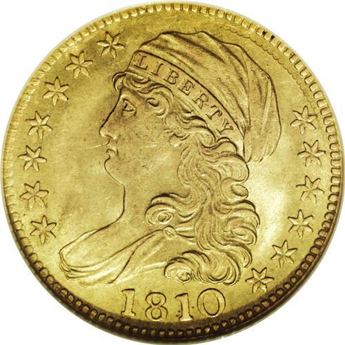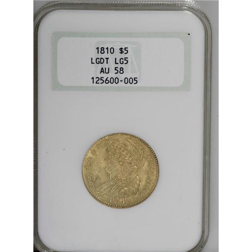 <B>1810 $5 Large Date, Large 5 AU58 NGC.</B></I> Breen-6459, BD-4, R.2. Although graded only AU58 by NGC within its early pre-hologram NGC holder, this green-gold example displays noticeable luster across the open fields. Light friction is apparent on the eagle's neck and Liberty's cheekbone. Minor adjustment marks are present near 9 o'clock on the obverse, but this is a pleasing piece certain to see floor bidding activity.<BR><BR><b>Shipping:</b> Coin/Currency (<a target="_blank" href="http://www.heritageauctions.com/common/shipping.php">view shipping information</a>)