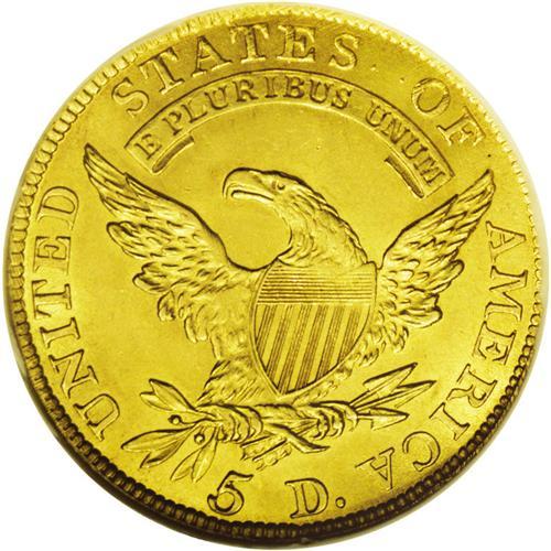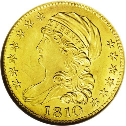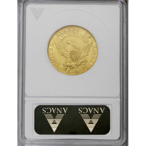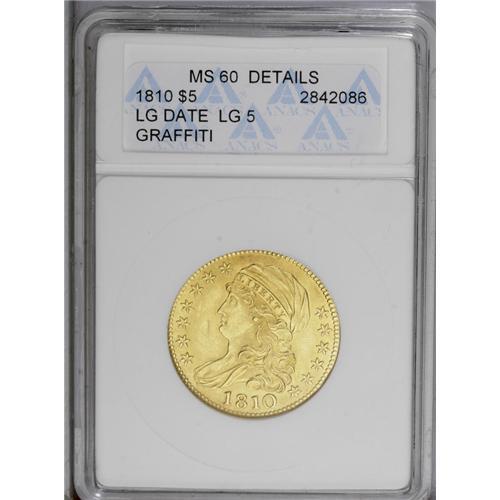 <B>1810<$5> Large Date, Large 5--Graffiti--ANACS. MS60 Details.</B></I> B. 1-A, Miller-109, R.2. Mint luster dominates the devices and legends, and encroaches upon the open fields. The initials IK (?) are pinscratched onto the lower left obverse field, but otherwise, this is a well preserved example of this popular gold type. Sharply struck save for minor weakness near the upper half of the shield.