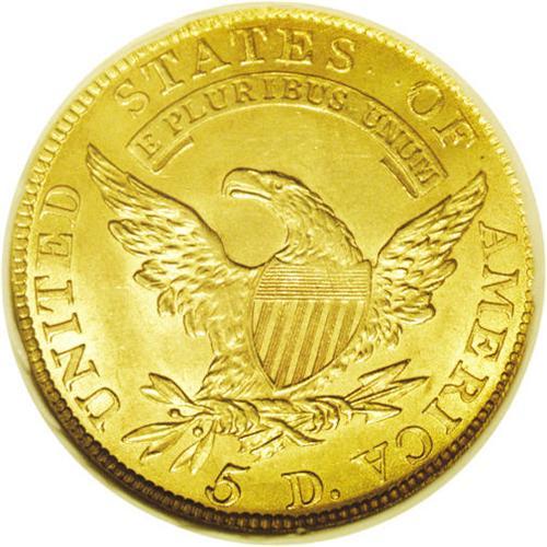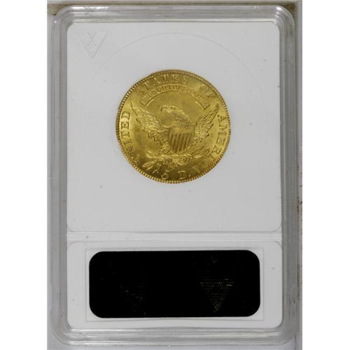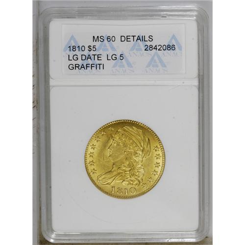 <B>1810<$5> Large Date, Large 5--Graffiti--ANACS. MS60 Details.</B></I> Breen-6459, BD-4, R.2. Mint luster dominates the devices and legends, and encroaches upon the open fields. The initials IK (?) are pinscratched onto the lower left obverse field, but otherwise, this is a well preserved example of this popular gold type. Sharply struck save for minor weakness near the upper half of the shield.