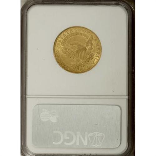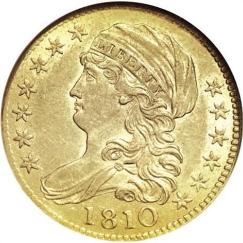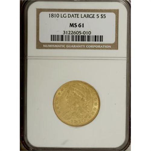 <B>1810 $5 Large Date, Large 5 MS61 NGC.</B></I> Breen-6459, BD-4, R.2. The requisite reference on early Federal gold coins by Bass-Dannreuther identifies this variety as BD-4, the last and most common of the four 1810 half eagle varieties. For those who follow varieties as listed in the <I>Guide Book</B></I>, this is the Large Date, Large 5 type. The coin offered here is of the earliest strikes from the BD-4 die marriage, as evinced by the lack of clash marks and die cracks observed on the three later states. The strike on this light green-gold example is slightly above average for the variety, as is the luster. A charming and pleasantly original 1810 five that was previously sold as part of the January 20, 1991 Stack's auction, where it was plated as lot 1754 (auction insert included).<B></B></I><BR><I>From The John Stimson, Sr. Collection, Part One.</B></I><BR><BR><B>Coin Engraver:</B> John Reich<BR><BR><b>Shipping:</b> Coins & Currency (<a target="_blank" href="http://www.heritageauctions.com/common/shipping.php">view shipping information</a>)