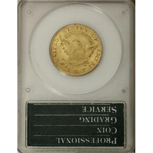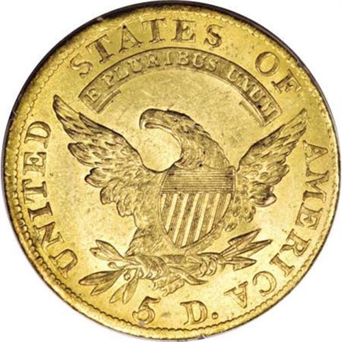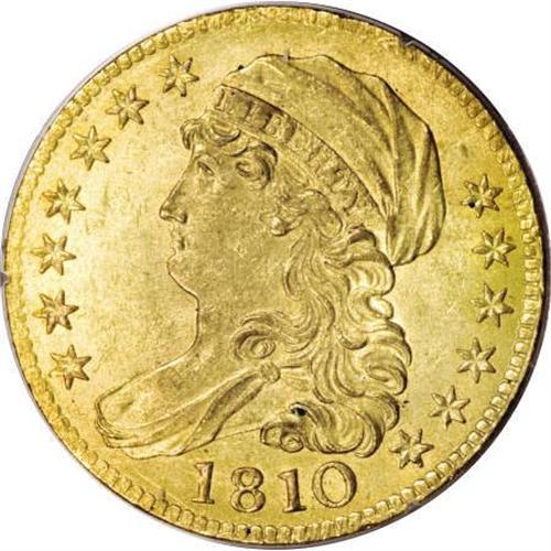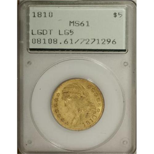 <B>1810 $5 Large Date, Large 5 MS61 PCGS.</B></I> Breen-6459, BD-4, R.2. The delicate yellow-gold toning over both sides of this appealing example is accented by soft, shimmering mint frost. The design elements are boldly struck in the centers, with some merging of the denticles noted on both sides. The surfaces are nicely preserved, for the grade, and lack any severe or overly distracting abrasions. Dannreuther-Bass (2006) calls this one of the most seen of all the early gold coins from 1795 to 1834, and notes that the mintage for this die marriage (one of four quarter eagle varieties in 1810) may have been as high as 90,000 pieces. Housed in a first-generation PCGS holder.<BR><BR><B>Coin Engraver:</B> John Reich<BR><BR><b>Shipping:</b> Coins & Currency (<a target="_blank" href="http://www.heritageauctions.com/common/shipping.php">view shipping information</a>)
