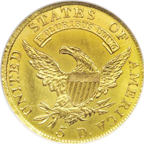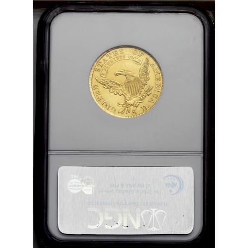 <B>1810<$5> Large Date, Large 5 MS63 NGC.</B></I> Breen-6459, BD-4, R.2. An exceptionally clean early half eagle that shows frosted mint luster and lovely chartreuse color. The strike is sharp on the obverse with full hair curls and complete radials on the stars, although star 1 touches a dentil and the E in LIBERTY is weak. The reverse is not quite as sharp as the obverse with some localized weakness on the arrow feathers and left (facing) talons of the eagle. The surfaces overall are very clean with only minor abrasions noted. There are some die lines in the center of the obverse, but these are minor and certainly not distracting. A small planchet bulge is noted to the right of obverse star 4. One of the more available dates among the Capped Bust Left series, but scarce in this condition.<BR><I>From The Clifton Rodenburg Collection.</B></I>