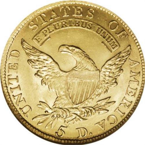 <B>1810 $5 Large Date, Large 5 MS63 NGC.</B></I> Breen-6459, BD-4, R.2. A simply splendid example of this early gold type coin, the most available of the Capped Bust Left series that ran from 1807 through 1812. Garrett and Guth point out that this date is one of the few of the type that can be found--for a price--in grades as high as MS66. This more-reasonable piece offers lustrous, relatively pristine greenish-gold surfaces. Only a few minuscule signs of contact preclude an even finer grade, but this piece nonetheless offers significant appeal at a reasonable cost of acquisition. Census: 30 in 63, 34 finer (8/07).<BR><BR><B>Coin Engraver:</B> John Reich<BR><BR><b>Shipping:</b> Coins & Currency (<a target="_blank" href="http://www.heritageauctions.com/common/shipping.php">view shipping information</a>)