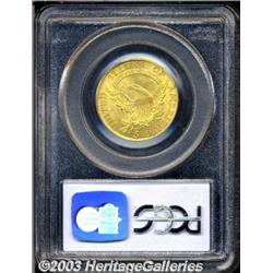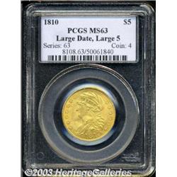 1810 $5 Large Date, Large 5 MS63 PCGS. Large Date, Large 5, Breen-6459, B. 1-A, Miller-109, R.2. Although no dates stand out as great rarities within the series, John Reich's Capped Bust Left is among the scarcer gold types. The four die marriages of 1810 are readily distinguished, as the 1s in the date and the 5 in the denomination have different styles and one (and only one) variety exists for each possible combination. While the two Small 5 varieties are very rare, the Large Date, Large 5 is generally available for a price in Uncirculated grades. A crisply struck piece that has slight softness of definition only on the portion of the wing near the left outline of the shield. Rich apricot-gold color confirms the originality, and only a few minor pinscratches preclude a higher designation. Important notice: Heritage usually auctions material at the rate of 200-250 lots per hour. On some occasions eBay Live bid software or the Internet may not be able to keep up with the pace of the auction. We recommend placing a realistic absentee bid now as insurance to avoid disappointment. Occasionally the auctioneer may eliminate or reject an eBay Live bid, and the auctioneer may also reopen a lot after the close of the eBay live bidding (usually because we missed an audience bid), and may reject your bid even if it shows you as the winning bidder. By bidding via eBay Live, you agree that Heritage may award the lot to another bidder at its sole discretion under the circumstances described above or any other reasonable circumstances. Also please note that all Heritage lots purchased through eBay Live carry a 20% Buyer's Premium. Please make sure you read the Terms and Conditions before you bid.