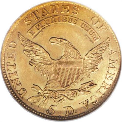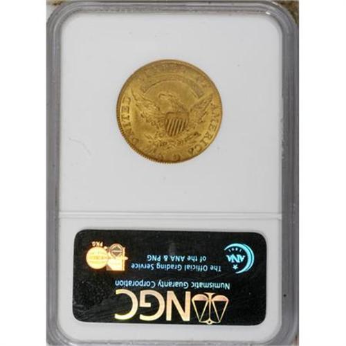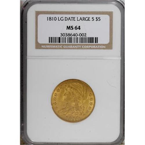 <B>1810 $5 Large Date, Large 5 MS64 NGC.</B></I> Breen-6459, BD-4, R.2. Four different die marriages were struck dated 1810, that included all combinations of Large and Small Date, and Large and Small 5 in the denomination. The two Small 5 varieties are significant rarities, while the two Large 5 varieties are comparatively available, although all pre-1834 gold coins are rare. The Large Date, Large 5 variety, that of the coin in this lot, is identified by a nearly horizontal flag on the 1 in the date (the 1 in the Small Date is at a steep angle), and a large squat 5 with its tip pointing to that of the feather.<BR> The Capped Bust Left motif was designed by John Reich. Walter Breen writes in his 1988 <I>Complete Encyclopedia of U.S. and Colonial Coins</B></I>:<BR><BR>"Almost six months to the day after John Reich became Assistant Engraver of the Mint, assigned to produce improved designs on all denominations, his new half eagles appeared; Mint Director J.R. Snowden (in an 1860 publication) said the date was Sept. 30, 1807. They promptly met with adverse criticism, some newspaper accounts characterizing Reich’s new effigy of Ms. Liberty on half eagles and half dollars as ‘the artist’s fat mistress.' "<BR><BR> Yellow-gold color imbued with hints of light tan-green enriches both sides of this near-Gem, and a solid strike manifests itself with sharp definition on the design features. The dentilation is strong, except for some weakness in the lower left obverse and upper left reverse. Lustrous surfaces are relatively well preserved, revealing just a few minor scuffs and luster grazes. Light adjustment marks on Liberty’s cheek do not distract in the least. This pleasing half eagle will fit comfortably in an early gold type set. Census: 28 in 64, 6 finer (6/07).<BR><BR><B>Coin Engraver:</B> John Reich<BR><BR><b>Shipping:</b> Coins & Currency (<a target="_blank" href="http://www.heritageauctions.com/common/shipping.php">view shipping information</a>)