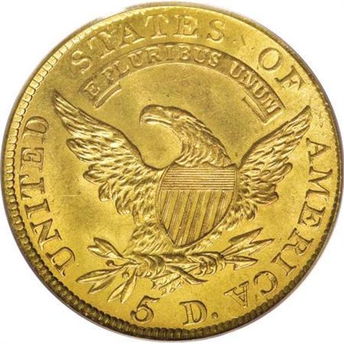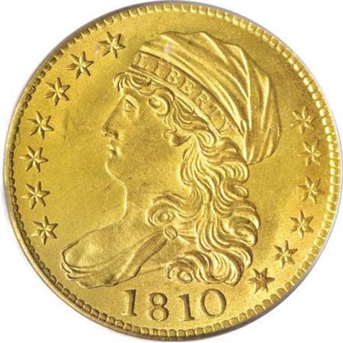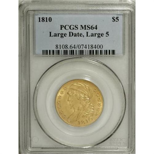 <B>1810 $5 Large Date, Large 5 MS64 PCGS.</B></I> Breen-6459, BD-4, R.2. There are four die marriages of 1810 half eagles. In a departure from the prior two years of the series, 1808 and 1807, none of the 1810 pieces are overdates. The four 1810 varieties each receive separate <I>Guide Book</B></I> listings, and are readily distinguished. BD-1 and BD-2 are Small Date varieties, identified by sloped 1s, while BD-3 and BD-4 are Large Date varieties, confirmed by the flat top to the 1s. BD-2 and BD-3 share the same Small 5 reverse. BD-1 has a Tall 5 with an open lower loop, while BD-4 possesses a Large 5 with broad, closed lower loop. The two Small 5 varieties are great rarities. The Tall 5 variety is scarce, but collectible. This leaves BD-4, The Large Date, Large 5 variety, as the most available 1810 variety. However, BD-4 must be seen within the context of its Capped Bust Left type. Any old tenor half eagle is much scarcer than the lighter weight Classic, Liberty, and Indian types that dominate half eagle appearances.<BR>This straw-gold representative is well struck, since most design elements are sharply impressed. A hint of incompleteness is noted on the left (facing) claw and the upper reaches of the shield. A few obverse denticles near 9 o'clock show slight merging of detail. There is no hint of adjustment or roller marks. The fields are remarkably smooth, and the devices are also unabraded. Satin luster dominates the borders and design features. MS64 is the highest collectible grade for BD-4, since as of (6/07), PCGS has certified only two pieces finer, an MS65 and an MS66.<BR><I>From The Julian Collection.</B></I><BR><BR><B>Coin Engraver:</B> John Reich<BR><BR><b>Shipping:</b> Coins & Currency (<a target="_blank" href="http://www.heritageauctions.com/common/shipping.php">view shipping information</a>)
