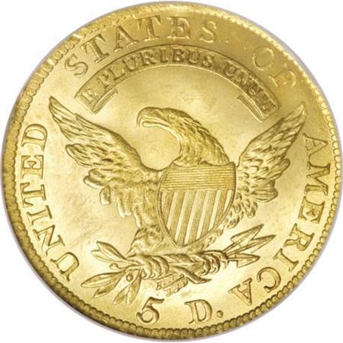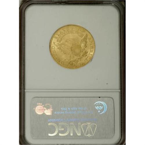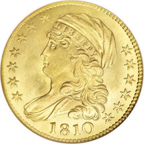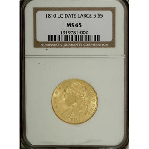 <B>1810 $5 Large Date, Large 5 MS65 NGC.</B></I> Breen-6459, BD-4, R.2. Many advanced numismatists have tackled the Capped Bust Left half eagle type, which was struck between 1807 and 1812. The series is collectible by date, unlike other early gold series that possess such costly stoppers as the 1796, 1797, 1815, 1822, and 1829. True, certain varieties, such as the 1810 Small Date, Small 5 and Large Date, Small 5 are extremely rare, but date collectors can choose the 1810 Small Date, Tall 5 or the 1810 Large Date, Large 5 as an affordable alternative.<BR> But date and type collectors still find the Capped Bust Left type to be a challenge. Over its entire six-year run, fewer than 400,000 pieces were struck, and most of the production was exported overseas and promptly melted to recover its bullion. Among those set aside, many were subjected to jewelry use, or were cleaned or otherwise mishandled by uninformed collectors. Compared to post-1834 half eagle types, few exist clean surfaces and unbroken cartwheel luster. Most Mint State 1810 half eagles lack highpoint friction, but the open fields are more subdued than the devices and borders.<BR> Its unabashed and original luster sets the present Gem apart from the typical Uncirculated Capped Bust Left half eagle. As one would expect from the MS65 level, marks are minimal, and are limited to a few delicate field grazes. The strike is good, with only slight softness present on the hair above the ear, and on the left (facing) wing near the shield. The type or date collector who has waited patiently to acquire a full-fledged Gem should take advantage of the present opportunity.<BR><I>From The Southwest Collection.</B></I><BR><BR><B>Coin Engraver:</B> John Reich<BR><BR><b>Shipping:</b> Coins & Currency (<a target="_blank" href="http://www.heritageauctions.com/common/shipping.php">view shipping information</a>)
