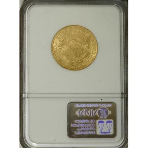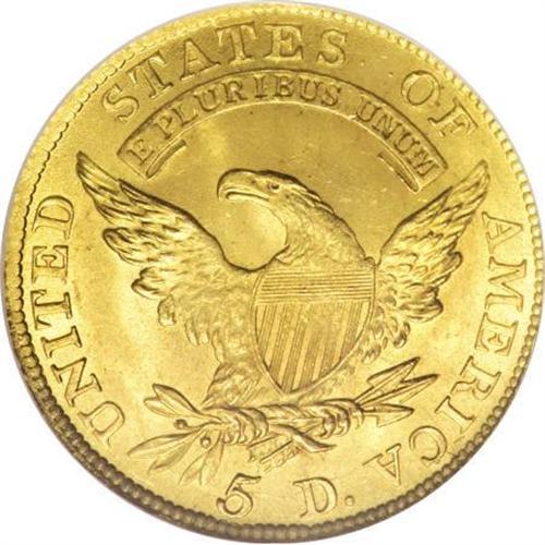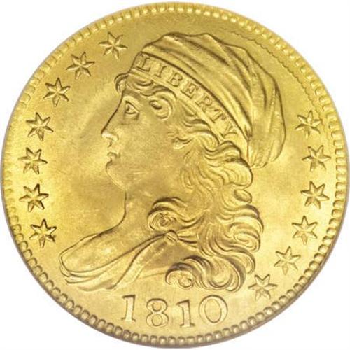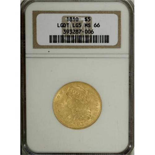 <B>1810 $5 Large Date, Large 5 MS66 NGC.</B></I> Breen-6459, BD-4, R.2. Half eagles, like half dollars, are inextricably linked as the workhorse denominations of early gold and silver coinage. However, gold unlike silver, was not available in the early days of the Republic. This was expounded upon in an article in a December 1985 <I>Coins </B></I>magazine<I> </B></I>by Earl Caldwell:<BR><BR> "The half eagle was viewed by the founding fathers as an integral part of the nation's future circulating coinage. When the mint was established April 2, 1792, the legislation contained provisions for three gold coins. ... Because it was one of the first coins authorized, it seems clear that Congress and President Washington felt certain the half eagle would have a place in our coinage.<BR> "This was further shown in the mint's early days. At the time, the mint had no way of supplying metal from which to make coins. Mint officials were forced to shop all over the world to find acceptable supplies of copper for smaller denominations. Great Britain, so recently a deadly foe, became a major force.<BR> "Bad as it might seem, it was even worse when it came to acquiring silver and gold. Silver could be obtained by melting foreign coins, which were abundant in circulation. Gold, however, was a troublesome situation; there were hardly large quantities of gold coins floating through the channels of commerce. ...<BR> "It took almost three years before there was any gold at the mint. A Boston merchant named Moses Brown showed up at the door one day with gold bullion--$2,276.22 in all--for the first recorded sale to the new government.<BR> "Whatever gold may have been on hand was clearly not enough to justify production of gold coins. With the Brown deposit, that situation changed, and the wheels were set in motion for the first U.S. gold coins."<BR><BR> By 1810, the half eagle was still seldom seen in commerce, but the denomination had gone through several design changes. The Capped Bust Left design was engraved by John Reich in 1807 and ran through 1812. In 1810, four date and denomination variants were struck. Of those, the Large Date/Large 5 is the variety usually encountered for the year. <BR> Early gold coins are extremely rare in MS66, regardless of the grading service. Only two other MS66s have been certified of the Large Date/Large 5 five dollar, one other NGC coin and one by PCGS (12/07). The single standout feature of this piece is its thick, frosted mint luster. It rolls around each side as the coin is tilted beneath a light, and only the most insignificant luster grazes are evident. The surfaces have a rich green-gold color with none of the red that is usually seen on early gold. The obverse devices are fully struck with complete radial lines on all the peripheral stars. On the reverse there is just the slightest softness of highpoint definition on the feathers of the eagle. An outstanding early type coin and worthy of the finest gold type set.<BR><I>From The Madison Collection.</B></I><BR><BR><B>Coin Engraver:</B> John Reich<BR><BR><b>Shipping:</b> Coins & Currency (<a target="_blank" href="http://www.heritageauctions.com/common/shipping.php">view shipping information</a>)