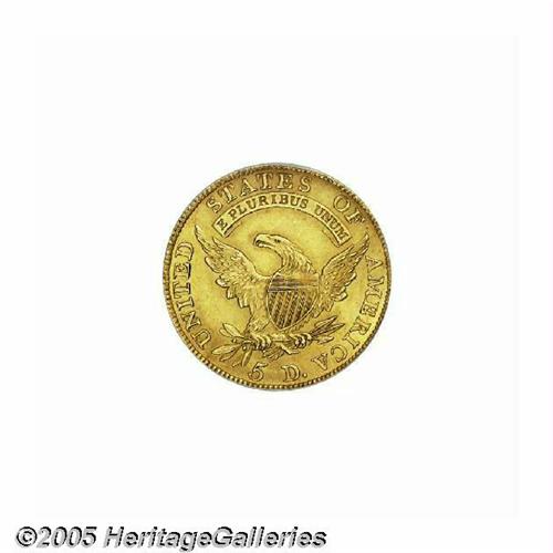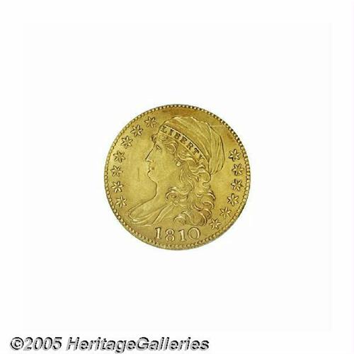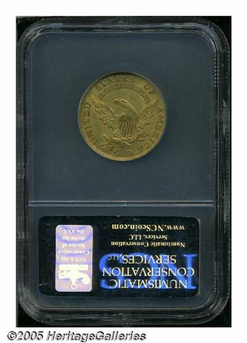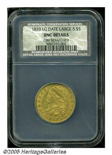 <B>1810<$5> Large Date, Large 5 Uncirculated Details, NCS.</B></I> Breen-6459, B. 1-A, Miller-109, R.2. There are some scratches or attempted initials in the left obverse field which are fairly light. Pleasing orange-gold and sharp otherwise. We note some minor peripheral adjustment marks on the reverse rim with a few present at the center as well. A decent coin for the grade, despite the minor problems.