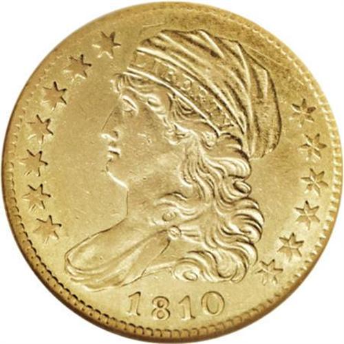 <B>1810 $5 Small Date, Tall 5 AU53 NGC.</B></I> Breen-6462, BD-1, High R.3. The Small Date, Tall 5 variety is considerably scarcer than the Large Date, Large 5 variety (BD-4), yet both trade at similar levels, due to strong type demand for John Reich's Capped Bust Left. A briefly circulated piece with copious luster and light straw-gold toning. Minor marks on the cheek and above the arrowheads are faded with time.<BR><BR><B>Coin Engraver:</B> John Reich<BR><BR><b>Shipping:</b> Coins & Currency (<a target="_blank" href="http://www.heritageauctions.com/common/shipping.php">view shipping information</a>)