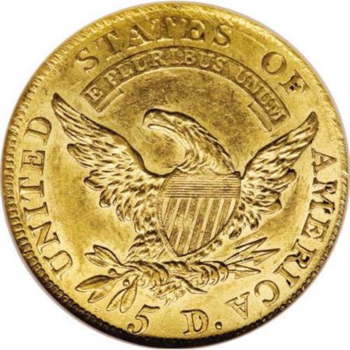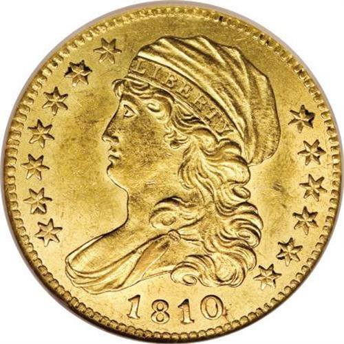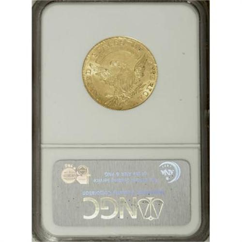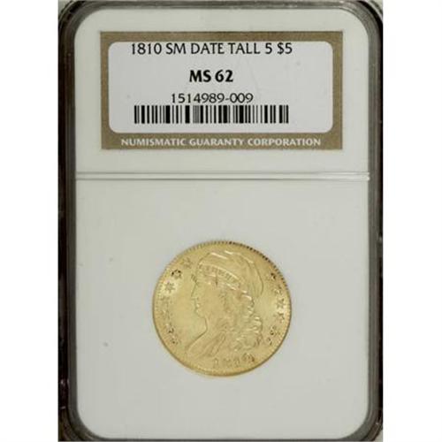 <B>1810 $5 Small Date, Large 5 MS62 NGC.</B></I> Breen-6462, BD-1, High R.3. This variety is attributed by the first 1 in the date almost centered over a dentil (minutely just left of center), the top of the 1 a bit higher than the 8, star 12 repunched, a faint crack through stars 3 to 6, and the feather tip well past the flag of the large 5. John Dannreuther and Harry Bass (2006) note that this variety is "much less often seen than the Large Date, Large 5 variety of this date, BD-4."<BR> Bright yellow-gold surfaces on this MS62 example display the most potent luster in the interstices of, and the areas around, the design elements. A well impressed strike brings out sharp definition on the motifs, and most of the dentilation is quite bold. Some faint adjustment marks are located at the rim of the upper left reverse quadrant, and a handful of minute contact marks are scattered over each side.<BR><I>From The Julian Collection.</B></I><BR><BR><B>Coin Engraver:</B> John Reich<BR><BR><b>Shipping:</b> Coins & Currency (<a target="_blank" href="http://www.heritageauctions.com/common/shipping.php">view shipping information</a>)