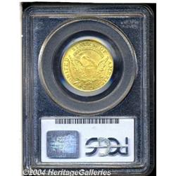 <B>1810<$5> Small Date, Large 5 MS62 PCGS.</B></I> B. 2-D, Miller-113, High R.5. Well frosted for the grade, the surfaces are pleasingly colored in green-gold shades. This is a well produced coin, and there are no areas of mentionable striking softness. A few light, shallow abrasions seem to account for the MS62 designation, but the eye appeal alone would do justice to a higher grade. Among Capped Bust Left Half Eagles, the 1810 B. 2-D is more difficult to locate than the 1807, 1808, 1809/8, 1811, and 1812. Only 100,287 Half Eagles of all varieties were produced with this date. <BR><BR><B>Important notice:</B> Heritage usually auctions material at the rate of 200-250 lots per hour. On some occasions eBay Live bid software or the Internet may not be able to keep up with the pace of the auction. We recommend placing a realistic absentee bid now as insurance to avoid disappointment. Occasionally the auctioneer may eliminate or reject an eBay Live bid, and the auctioneer may also reopen a lot after the close of the eBay live bidding (usually because we missed an audience bid), and may reject your bid even if it shows you as the winning bidder. By bidding via eBay Live, you agree that Heritage may award the lot to another bidder at its sole discretion under the circumstances described above or any other reasonable circumstances. Since eBay bids are not shown to us until we open the lot on the floor, we treat those bids just like floor bids. In most cases the floor responds before the eBay bid is presented to us, due to Internet lag time, so for consistency we have made it a policy that floor bids are always considered first over tie eBay live bids. Also please note that all Heritage lots purchased through eBay Live carry a 20% Buyer's Premium. Please make sure you read the Terms and Conditions before you bid.