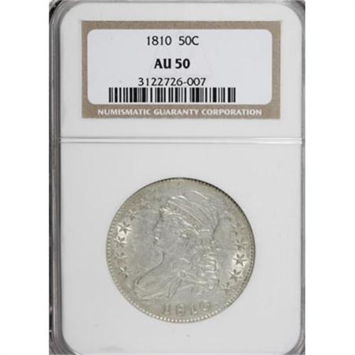 <B>1810 50C AU50 NGC.</B></I> O-106, R.3. The obverse of this die pairing features a widely spaced and well centered date with small digits. On the reverse a long die line slants diagonally northeast from the shield corner into the eagle's right (facing) wing. Luster is visible in the recesses of the silver-white, remarkably clean surfaces. Generally well defined.<BR><BR><B>Coin Engraver:</B> John Reich<BR><BR><b>Shipping:</b> Coins & Currency (<a target="_blank" href="http://www.heritageauctions.com/common/shipping.php">view shipping information</a>)